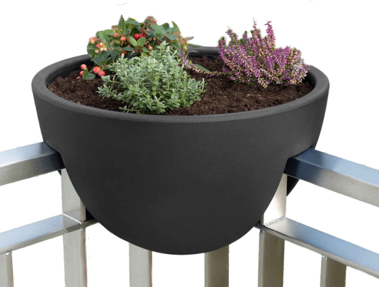 Durchmesser: 44 cm (nahezu doppeltes Fassungsvermögen im Vergleich zu im Baumarkt erhältlichen Geländertöpfen