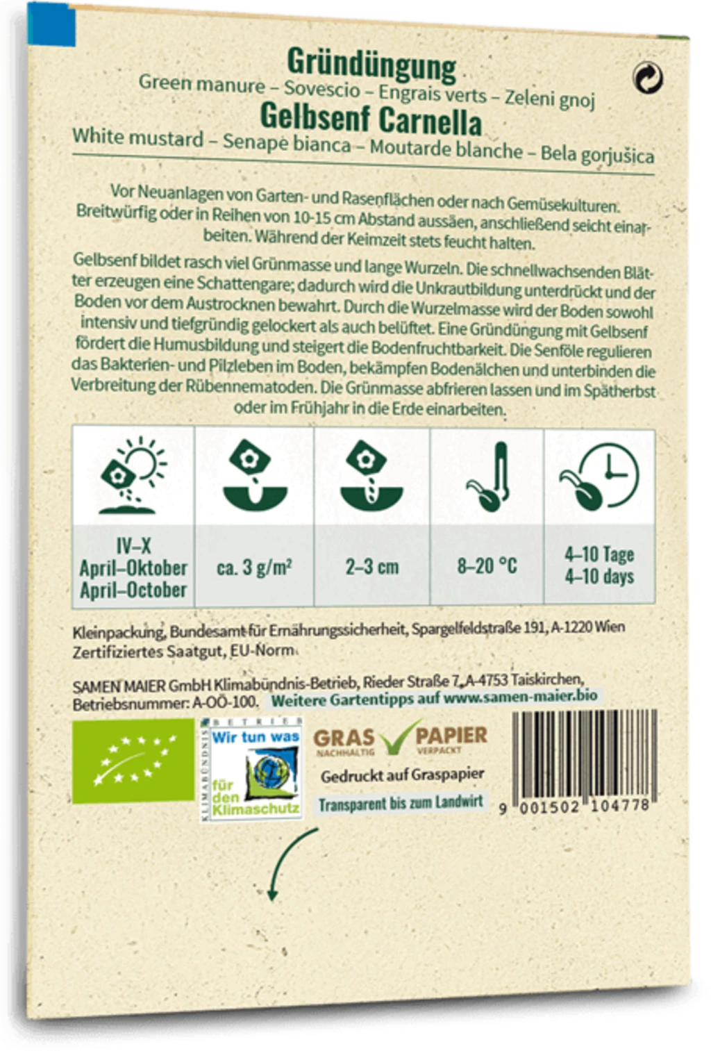 Gelbsenf als Gründüngung eignet sich vor allem bei Neuanlagen von Garten- und Rasenflächen sowie nach dem Anbau von Gemüsekulturen. Es sorgt für einen lockeren, gut belüfteten Boden und fördert die Humusbildung. Da sich das Grün ziemlich rasch entwickelt, wird die Unkrautbildung effektiv minimiert.