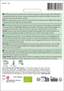 Sonnenblumen Keimsprossen besitzen einen besonders delikaten, nussigen Geschmack. Sie harmonieren vor allem mit kalten Speisen, wie Tomaten, Müslis, Desserts und Früchten.