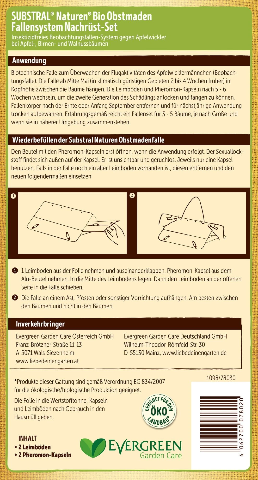 Das Fallensystem „Nachfüll-Set“ beinhaltet 2 Leimböden und 2 Pheromonkapseln. Perfekt gegen Maden des Apfelwicklers bei Apfel-, Birnen- und Walnussbäumen.