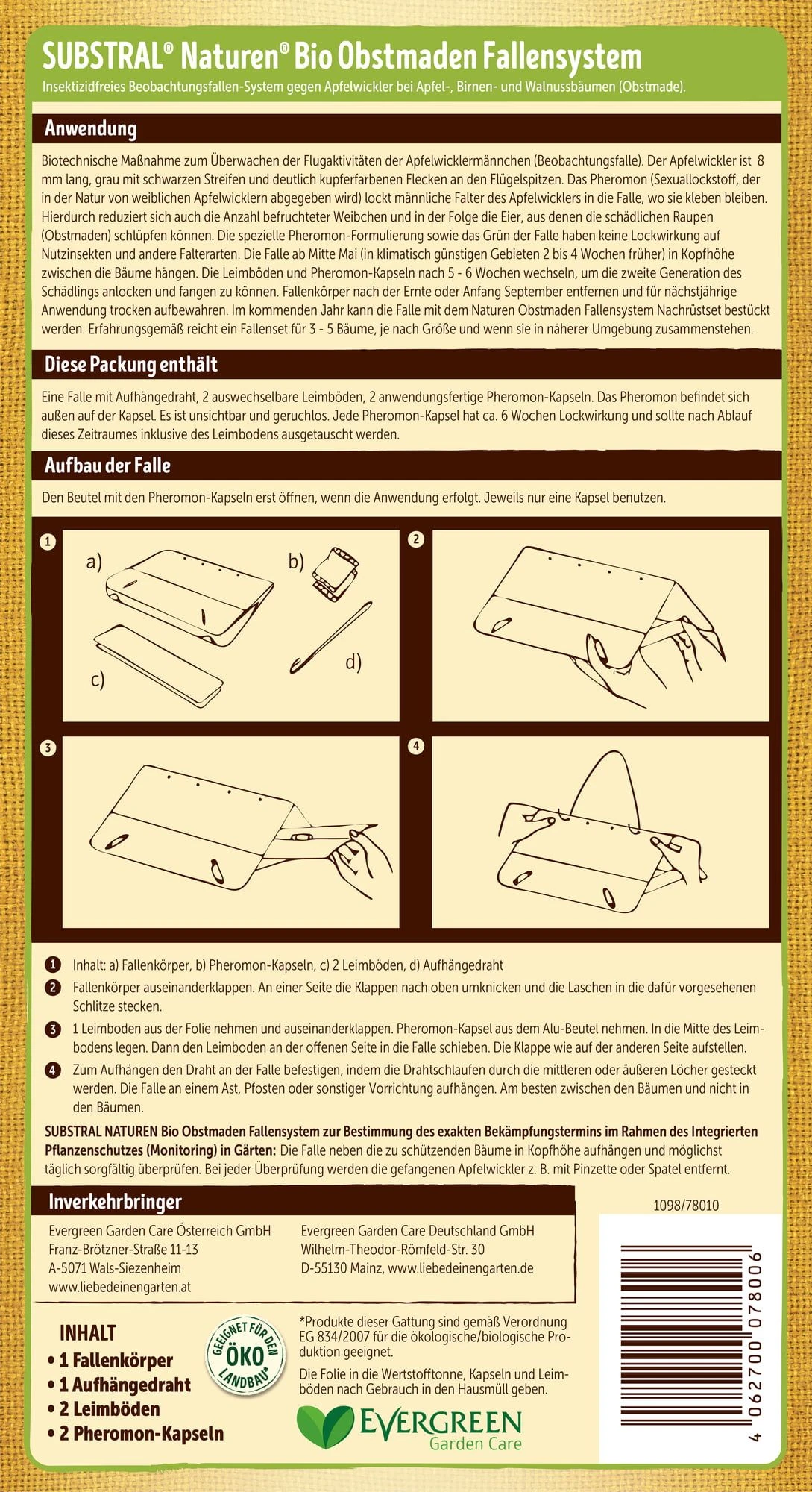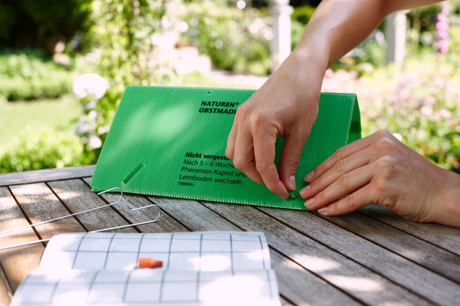 Das anwendungsfertige Fallensystem zur Befallskontrolle von Apfelwickler an Kernobst wirkt phänomenal. Das Pheromon (natürlicher Sexuallockstoff) lockt männliche Falter des Apfelwicklers an, diese bleiben dann am Leimboden der Falle kleben. Somit werden die Weibchen nicht befruchtet und legen keine Eier ab, aus denen die schädliche Raupe (Obstmade) schlüpft.