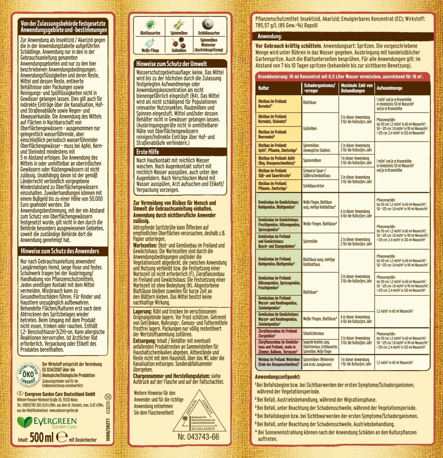 Die abgestorbenen Blattläuse können für kurze Zeit an den Blättern kleben bleiben. Das Konzentrat verfügt über keine nachhaltige Wirkung. Die Spritzbrühe könnte auf empfindlichen Oberflächen Ölflecken verursachen. (Zum Schutz – Papier unterlegen.)