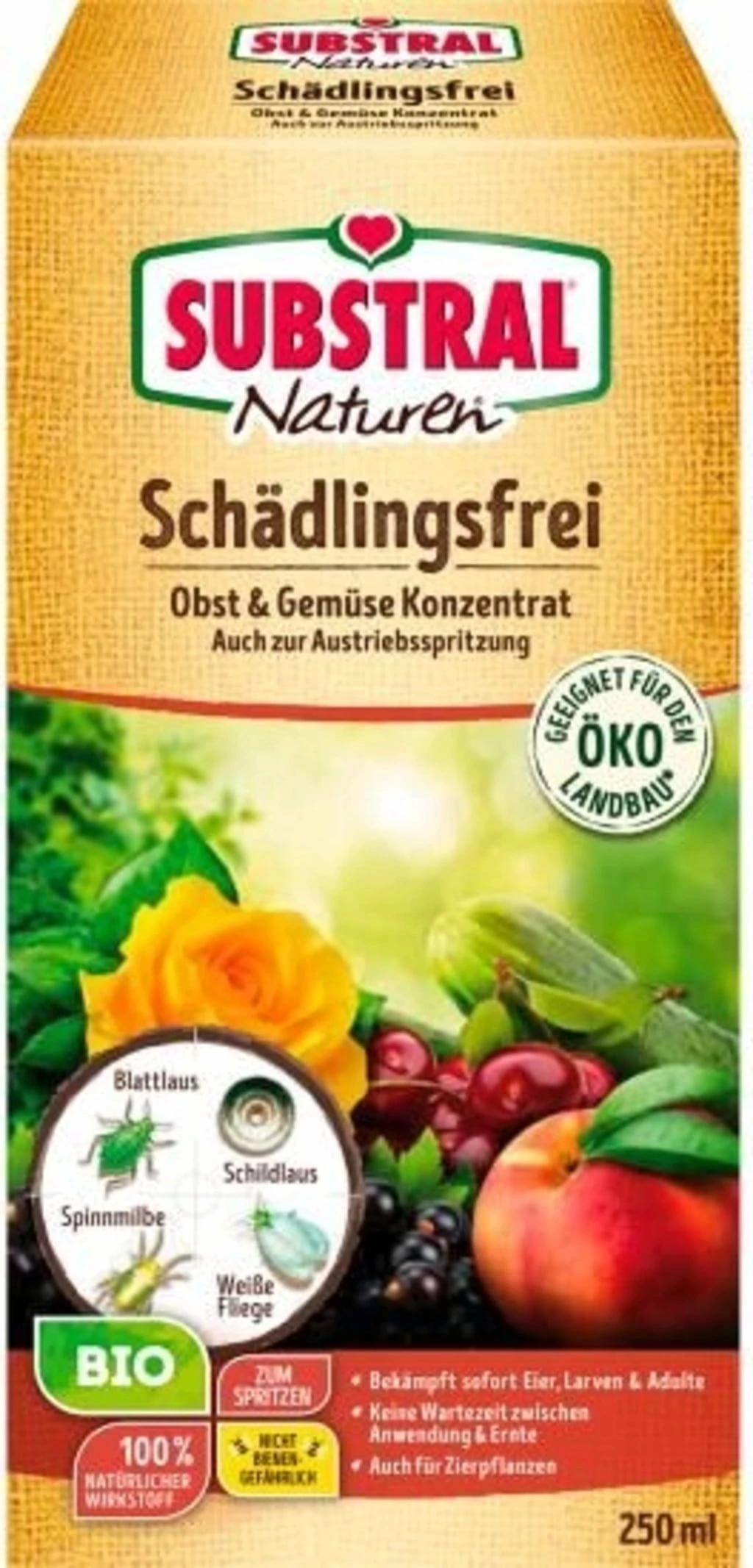 Das Schädlingsfrei Obst & Gemüse Konzentrat wurde aus einem natürlich, nachwachsenden Rohstoff hergestellt. Nützlinge wie Florfliegen, Raubmilben und Laufkäfer werden geschont. Die Wirkung erfolgt durch eine Abkapselung der Schädlinge und deren Eier. Für einen Bekämpfungserfolg ist eine gründliche Anwendung auf allen Pflanzenteilen (auch Blattunterseite) nötig.
