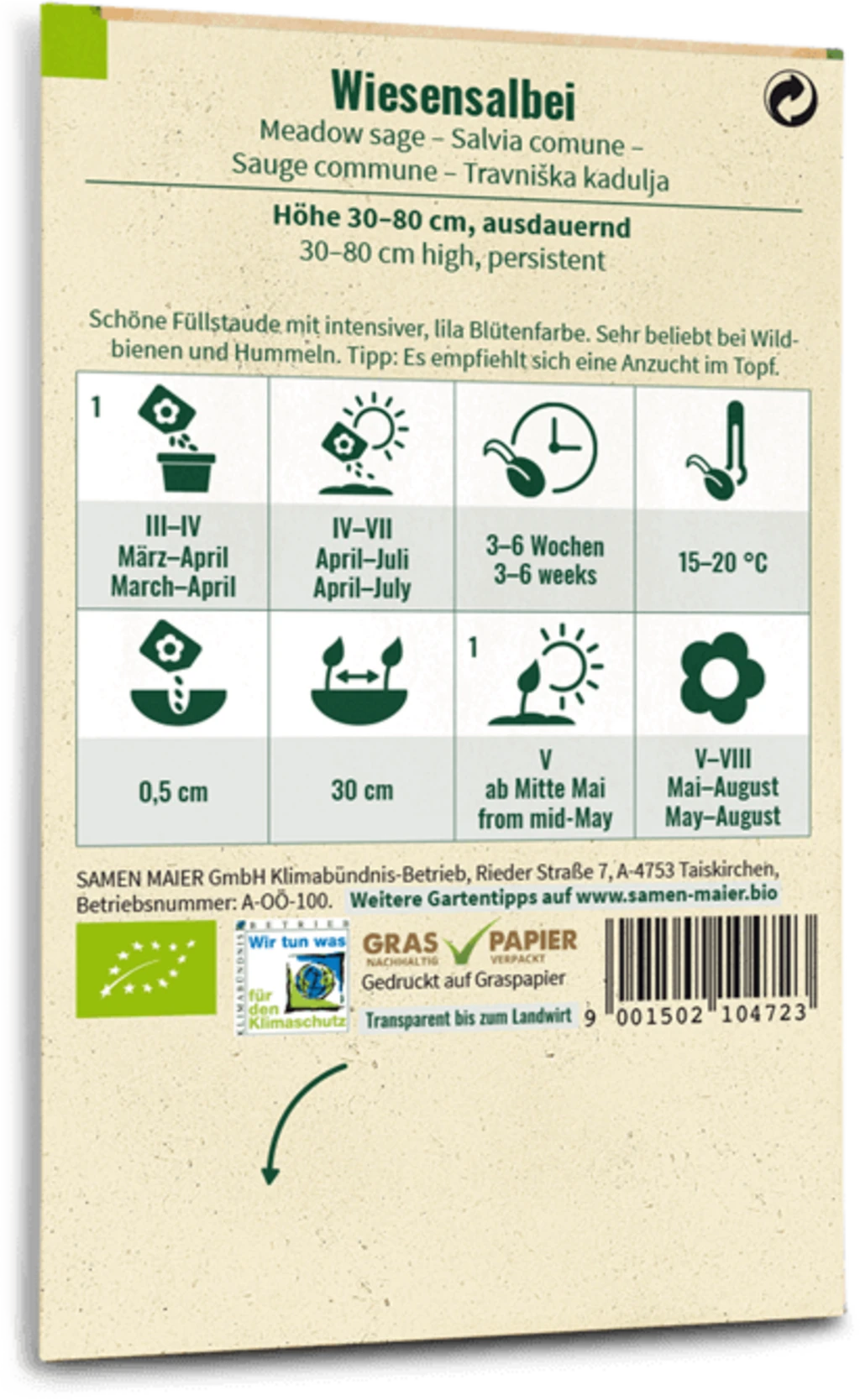 Wildblumen von Samen Maier sind in Graspapier verpackt. Dieses wird ohne den Einsatz von Chemikalien und mit deutlich weniger Energie- sowie Wasserverbrauch aus dem schnell nachwachsenden Rohstoff Gras hergestellt. So ist es ein nachhaltiges und besonders umweltfreundliches Verpackungsmaterial.