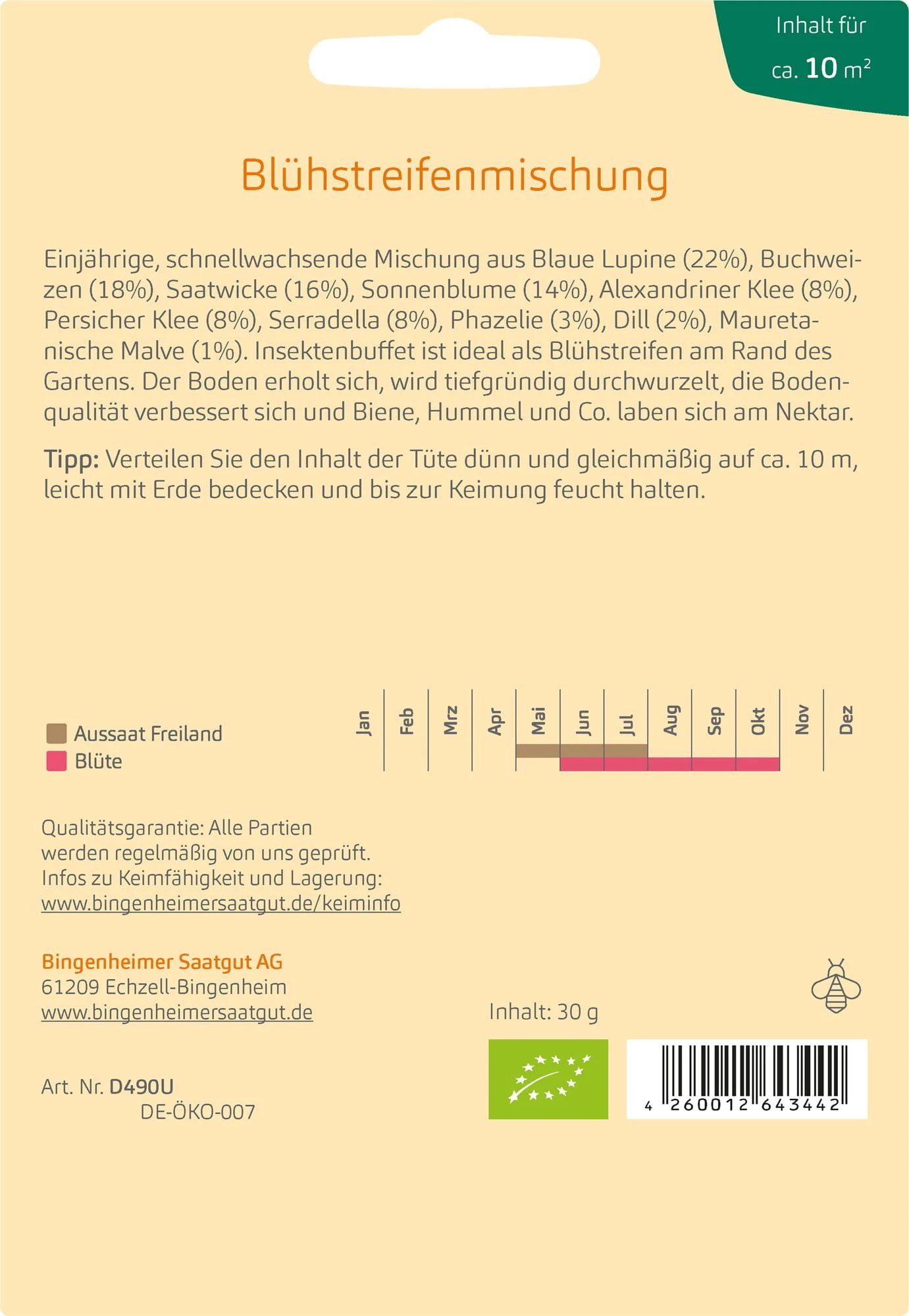 Diese einjährige Blühstreifenmischung ohne Kreuzblütler eignet sich besonders für Erwerbsbetriebe und enthält wertvolle Insektenfutterpflanzen. Ihr rasches Wachstum sorgt für gute Beikrautunterdrückung.