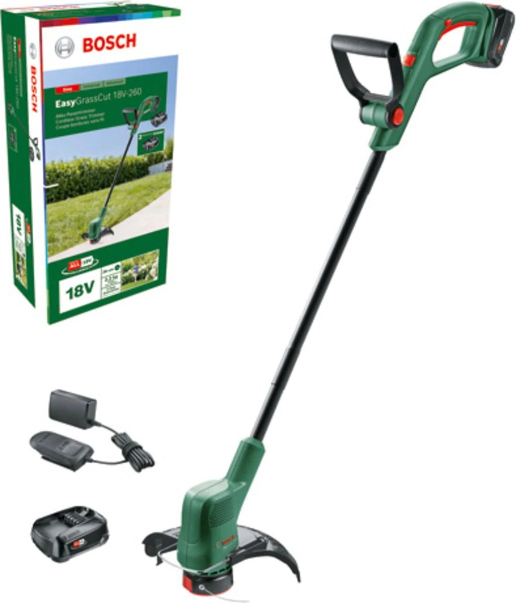 Der EasyGrassCut 18V-260 Rasentrimmer von BOSCH sorgt für einfaches und bequemes Trimmen von Gras und Unkraut. Der kabellose Trimmer verfügt über eine halbautomatische Spule und schafft eine Schnittgeschwindigkeit von 8.500 Umdrehungen pro Minute.