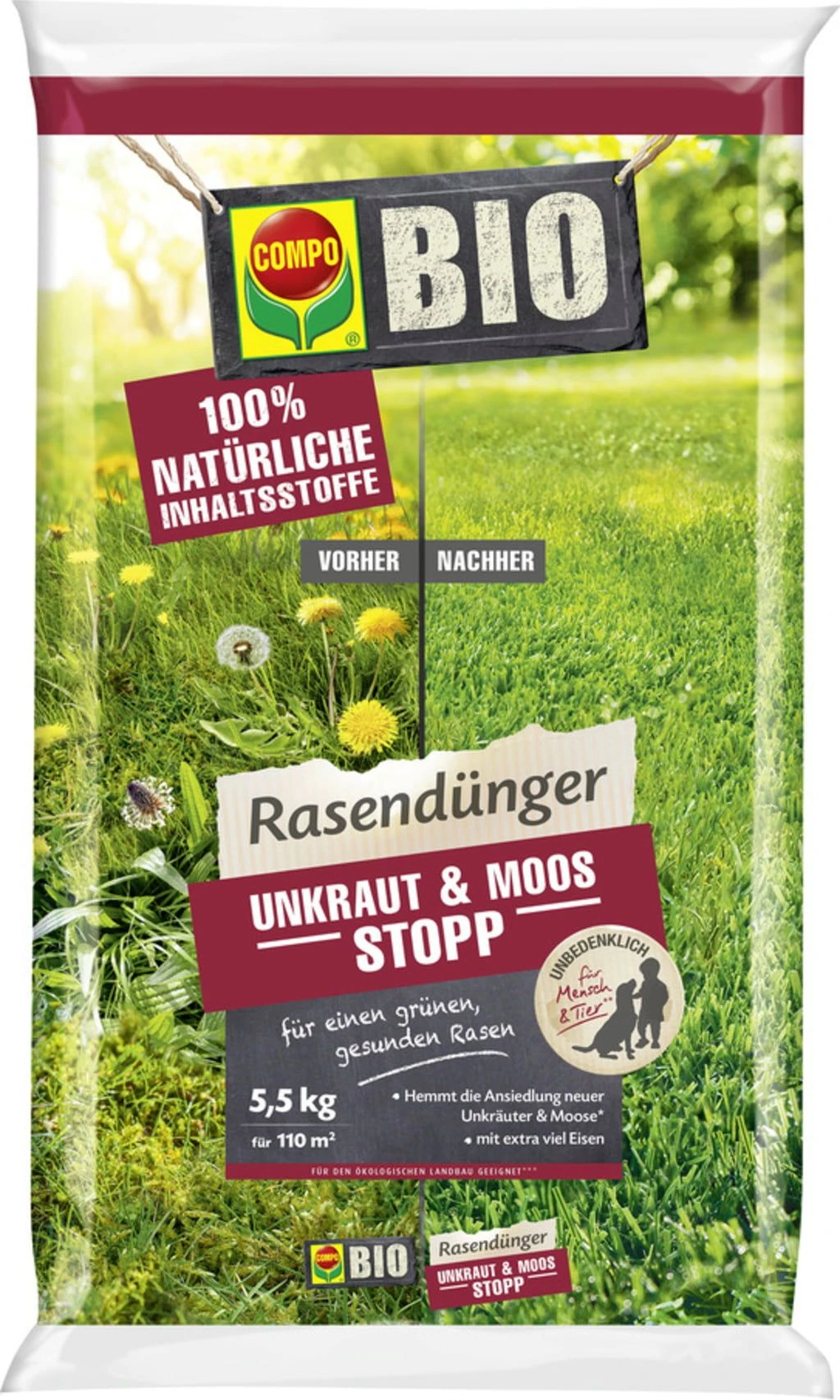 Wer träumt nicht von einem gepflegten Rasen, ohne Unkraut und Moos? Mit dem Bio Rasendünger – Unkraut & Moos Stopp von COMPO lässt sich dieser Traum ganz einfach in die Realität umsetzen. Eine regelmäßige Anwendung macht es Unkrautsamen unmöglich, sich zu entwickeln. Die enthaltenen Nährstoffe hingegen lassen deinen Rasen kräftig und sattgrün erstrahlen. Und das mit 100 % natürlichen Inhaltsstoffen!