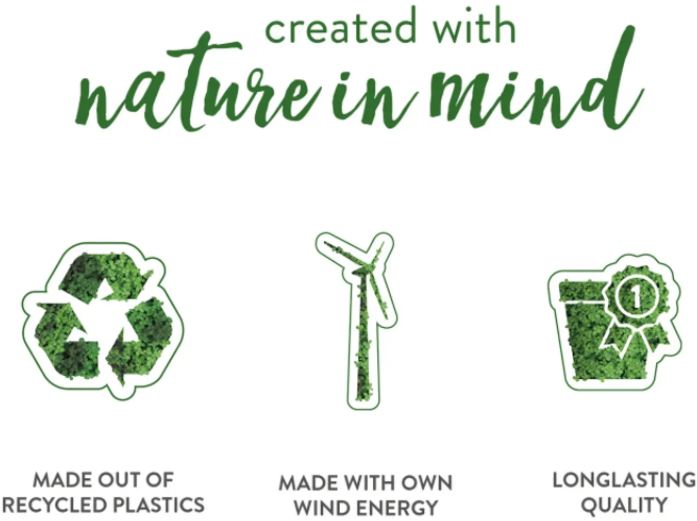 | Eigenschaften: | UV-beständig, Recycelter Kunststoff, Frostbeständig, Mit Bewässerungssystem, Wasserablauf möglich, Bruchsicher, 100 % recycelbar, Nachhaltig hergestellt, Wetterfest |