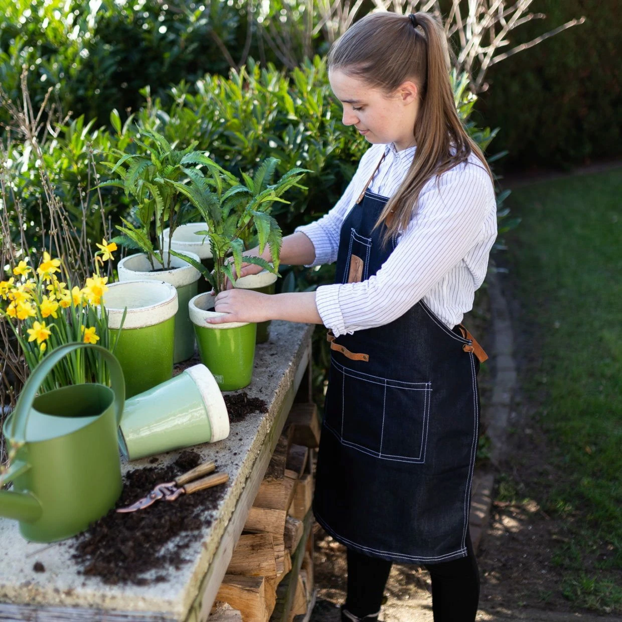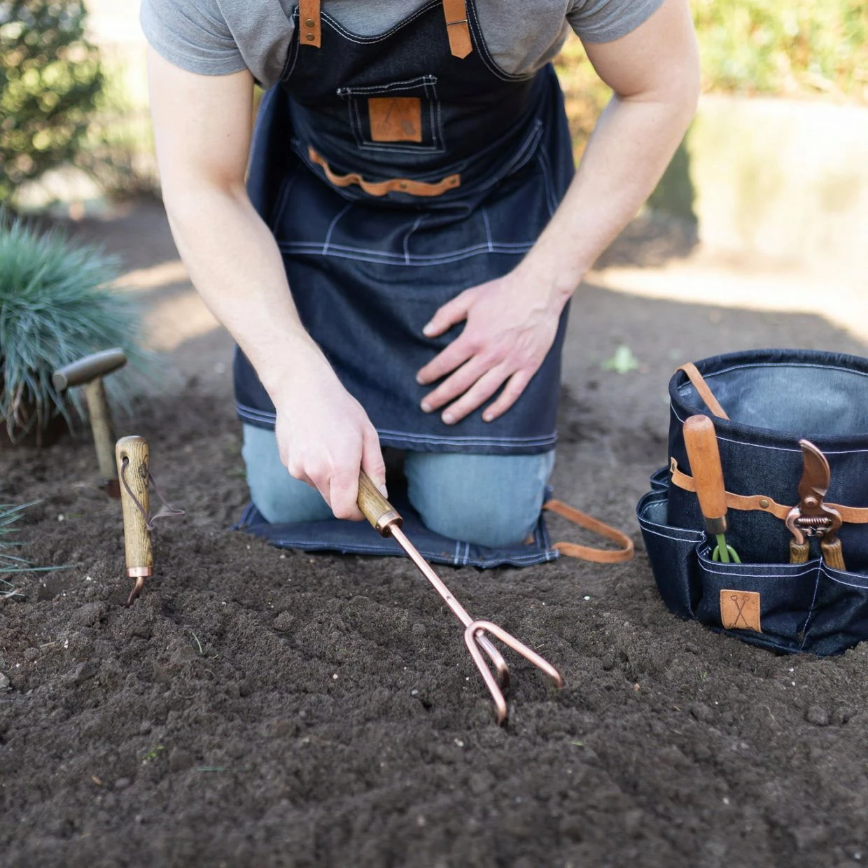 Mit der Gartengeräteschürze wird die Kleidung zuverlässig vor Verschmutzung geschützt. Das Material aus Denim ist angenehm zu tragen und wird mit Details auch echtem Leder aufgepeppt. Mit vielen Taschen ausgestattet, hat man Werkzeuge, Bindmaterial und Co. stets griffbereit und gleichzeitig die Hände frei zum Arbeiten.