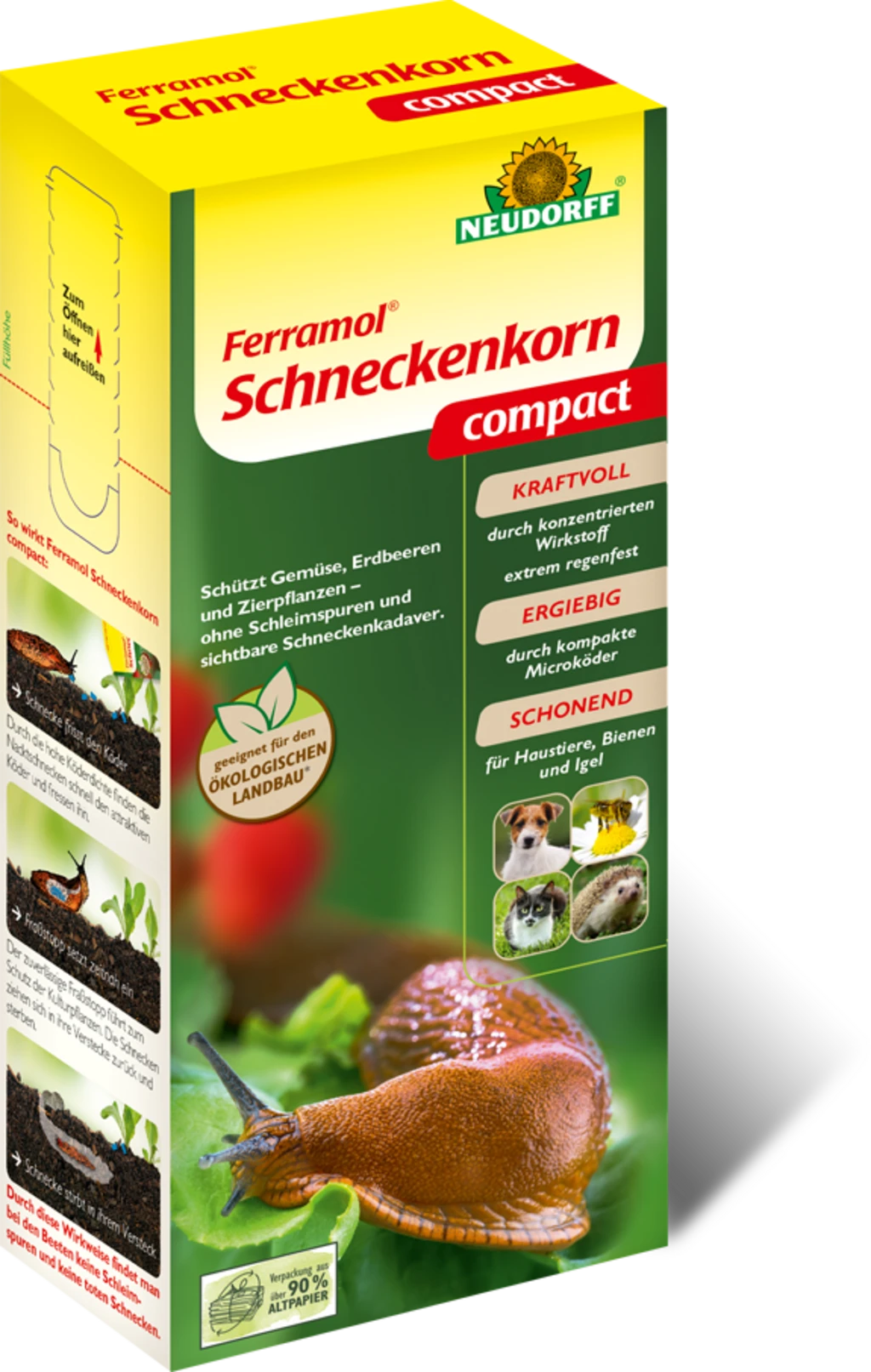 Kraftvoller Kompaktköder gegen Nacktschnecken an allen Gemüse-, Obst- und Zierpflanzen-Arten und natürlicher Eisenverbindung als Wirkstoff. Wirkt schonend auf Bienen, Haustiere, Igel und andere Nützlinge und ist nicht bienengefährlich. Extrem regenfest durch innovative Ködertechnologie und gemäß EG-Öko-Verordnung für den ökologischen Landbau zugelassen.