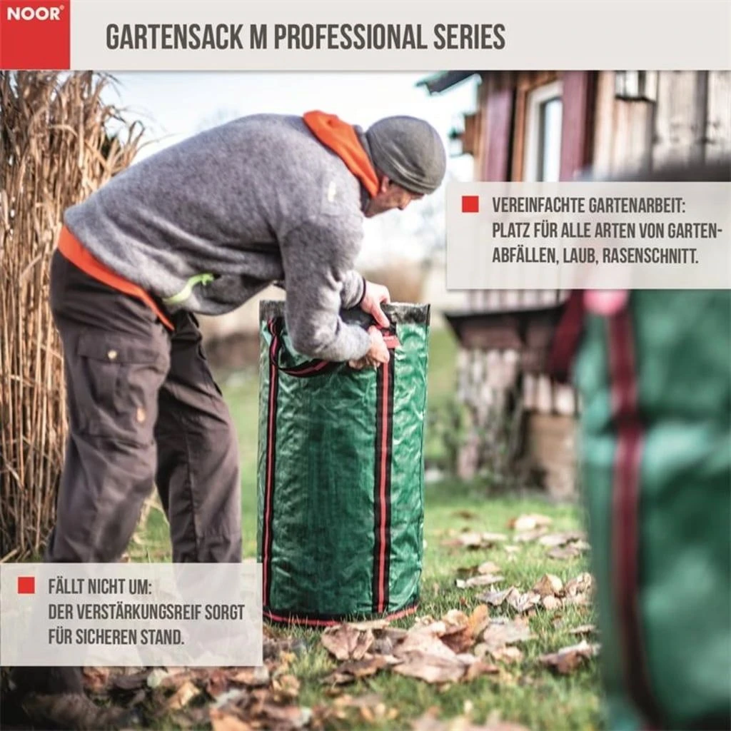 Mit dem Gartensack „Professional“ erhältst du Verstärkung in Profi-Qualität. Für das außerordentlich belastbare Gewebe sind auch schwere Inhalte kein Problem. Zusätzlich wurde der Gartensack mit komplett umlaufenden Gurten verstärkt. Ganz besonders beliebt ist er zum Sammeln und Tragen von Grünschnitt, Laub oder Zweigen. Aber auch zum Aufbewahren von Brennholz oder Transportieren von Altglas ist der Gartensack „Professional“ nicht mehr wegzudenken.