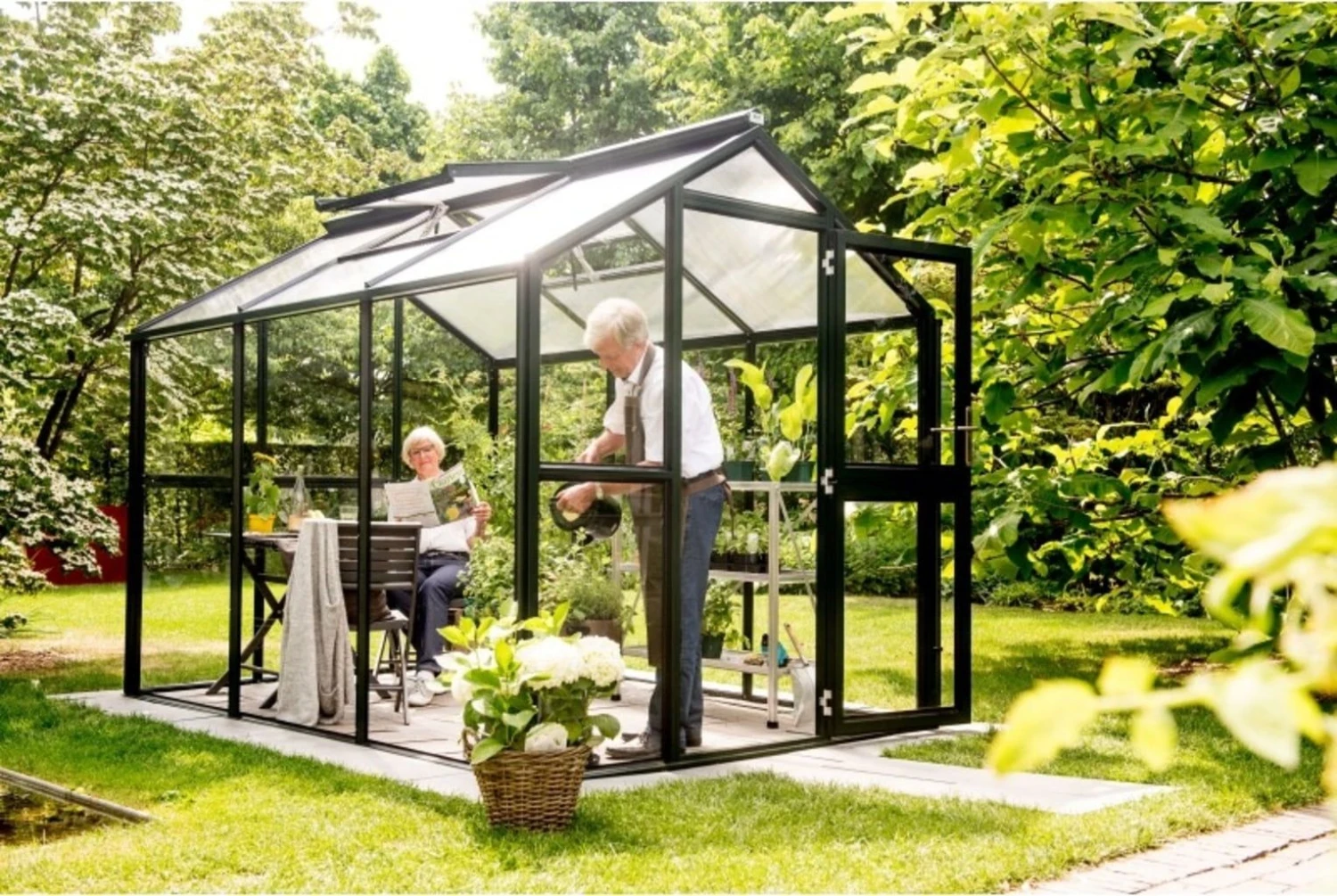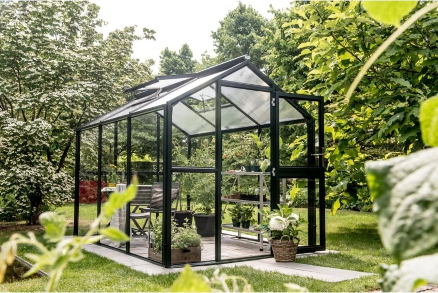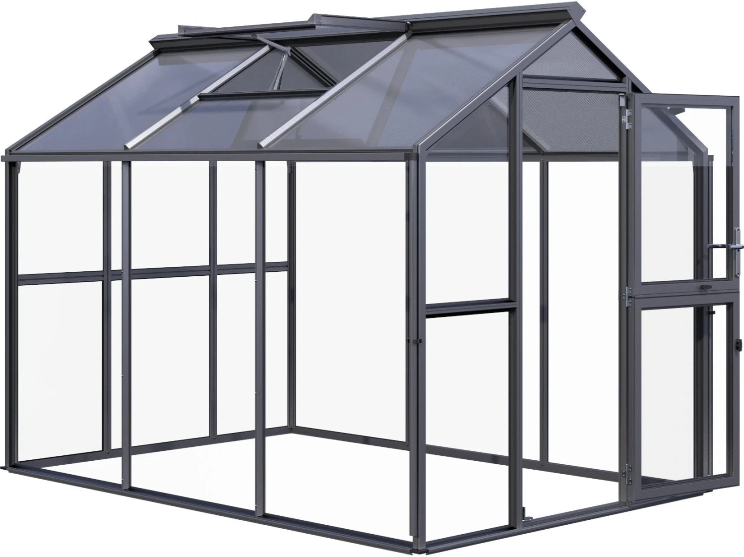 Die transparenten ISO-Hohlkammerplatten am Dach weisen mit ihrer Stärke von 10 mm eine sehr gute Wärmeisolierung auf, wohingegen die Seitenwände aus Sicherheitsglas für einen freien Blick nach draußen sorgen. Durchgängige Aluminiumprofile sowie eine ausgereifte Verglasungstechnik sorgen für die notwendige Stabilität. Das edle Farbbild in Anthrazit verkörpert dabei zeitlose Eleganz, sodass sich das Gewächshaus mit Leichtigkeit in jeden Gartenstil einfügt.