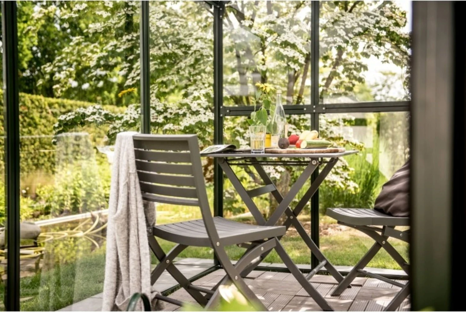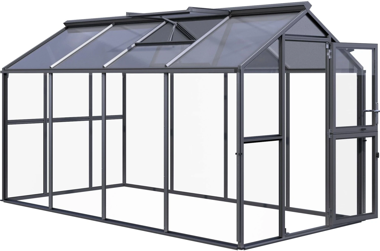 Die transparenten ISO-Hohlkammerplatten am Dach weisen mit ihrer Stärke von 10 mm eine sehr gute Wärmeisolierung auf, wohingegen die Seitenwände aus Sicherheitsglas für einen freien Blick nach draußen sorgen. Durchgängige Aluminiumprofile sowie eine ausgereifte Verglasungstechnik sorgen für die notwendige Stabilität. Das edle Farbbild in Anthrazit verkörpert dabei zeitlose Eleganz, sodass sich das Gewächshaus mit Leichtigkeit in jeden Gartenstil einfügt.