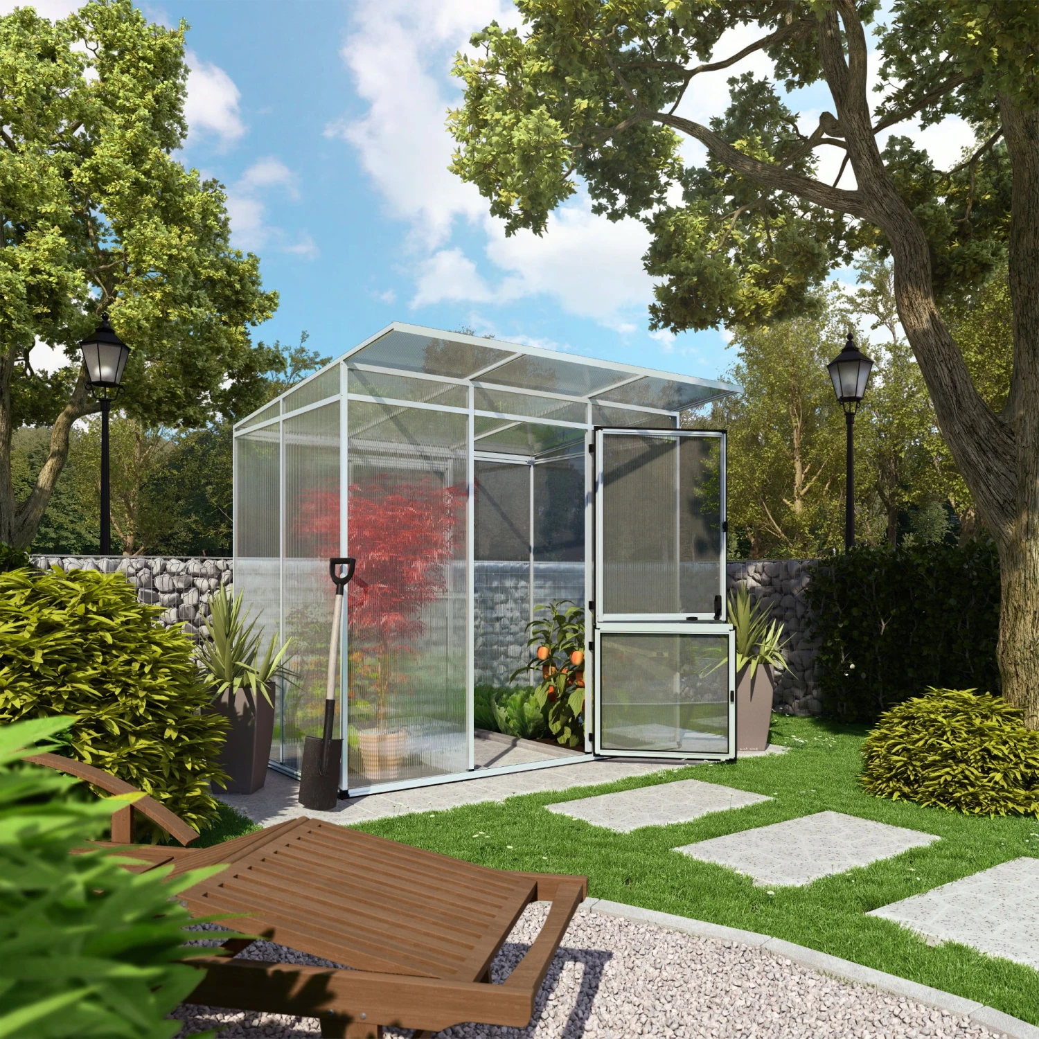 Äußerst komfortabel ist die breite, geteilte Drehtür, die sich bei Bedarf abschließen lässt. Eine optimale Belüftung ist durch das große Rückwandfenster mit Handaufsteller gegeben. Eine Dachrinne mit Fallrohr lässt Regenwasser unverzüglich abfließen, welches optional zum Gießen aufgefangen werden kann.