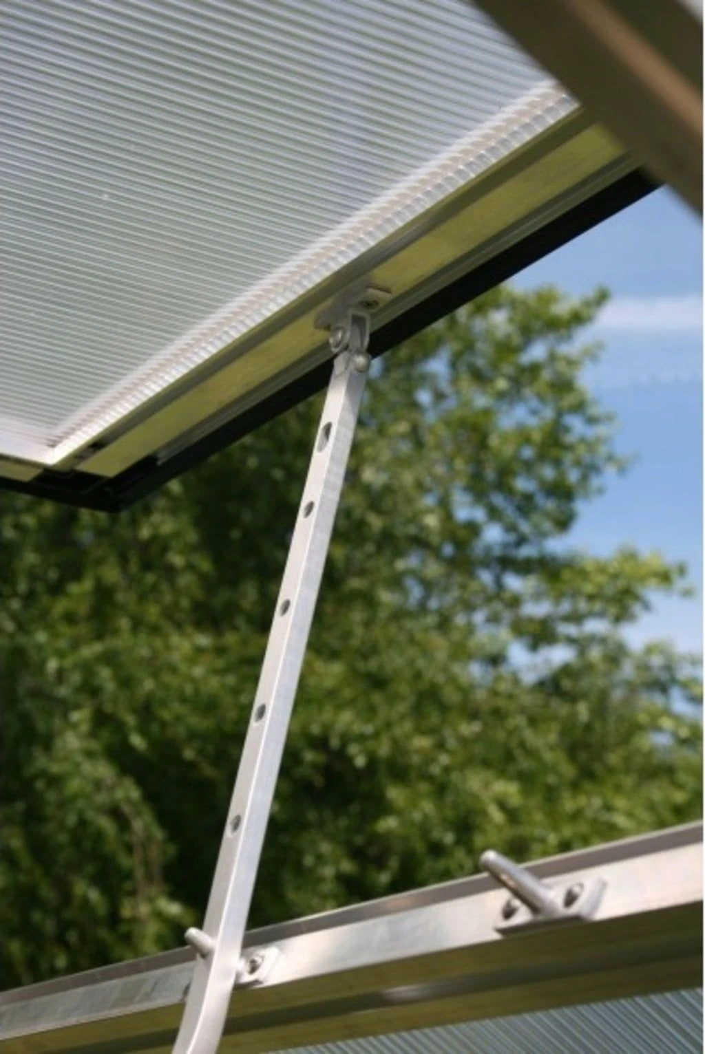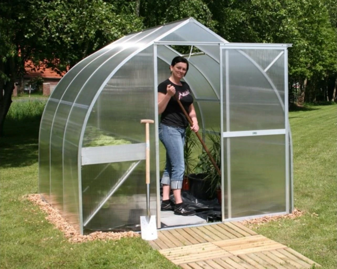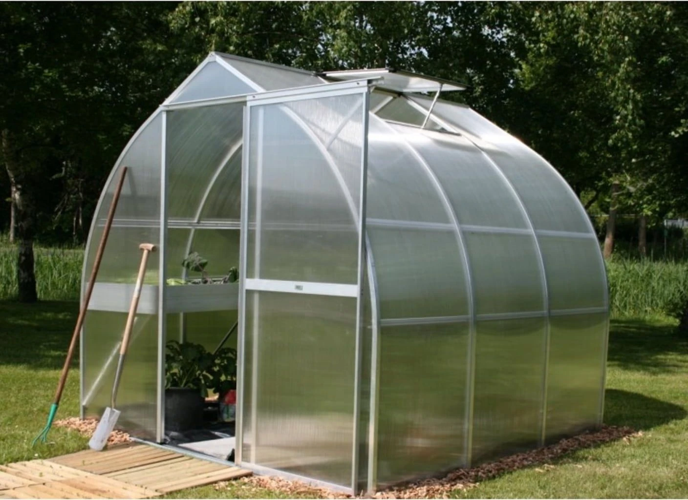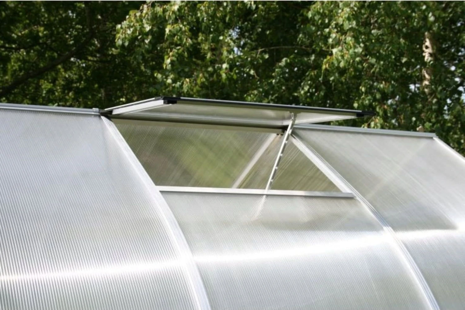Durchgängige Aluminiumprofile sowie eine ausgereifte Verglasungstechnik gewährleisten eine enorme Stabilität und die damit einhergehende Sicherheit. Die transparenten, 6 mm starken ISO-Hohlkammerplatten aus hochbruchfestem Polycarbonat wirken wärmeisolierend, sodass bereit sehr früh im Jahr mit der Aufzucht von Pflanzen begonnen werden kann.