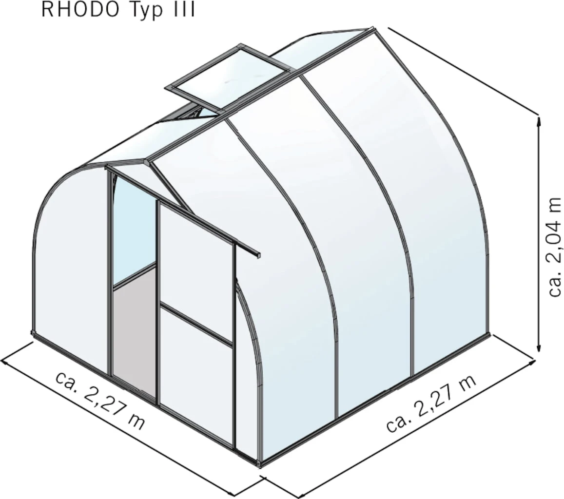 Das Gewächshaus „Rhodo“ ist das optimale Einsteigermodell und gewährleistet beste Bedingungen für die Aufzucht und Pflege von Pflanzen. Die runde und sich nach oben verjüngende Zwiebelform ist nicht nur ein optischer Hingucker, sondern sorgt ganz nebenbei für einen hervorragenden Lichteinfall. Neben der breiten, leichtgängigen Schiebetür ist das Gewächshaus zusätzlich mit einem Dachfenster inkl. Handaufsteller ausgestattet, wodurch eine optimale Be- und Entlüftung gewährleistet werden kann.