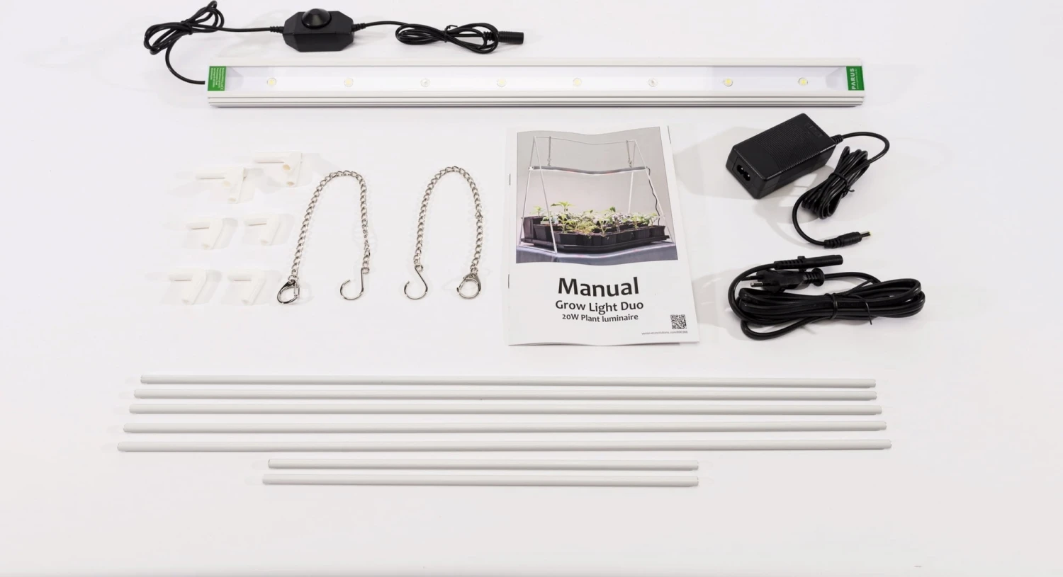 Die praktische Anzuchtlampe „GrowLight Duo“ verfügt über weiße und rote LEDs, um Anzuchtpflänzchen optimal zu beleuchten. Dank des integrierten Dimmers kann die Lichtintensität je nach Wachstumsstadium angepasst werden. Die Lichtleiste kann an dem im Set enthaltenen Aluminium-Stativ befestigt werden, wobei sich der Abstand zu den darunter stehenden Pflanzen mittels Ketten einfach und unkompliziert justieren lässt. Die Kombination der beiden Lichtfarben trägt nachhaltig zum gleichmäßigen Wurzel-, Sproß- und Blütenwachstum bei – für gesunde Pflanzen und fröhliche Gärtner.