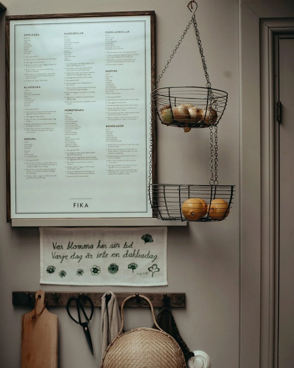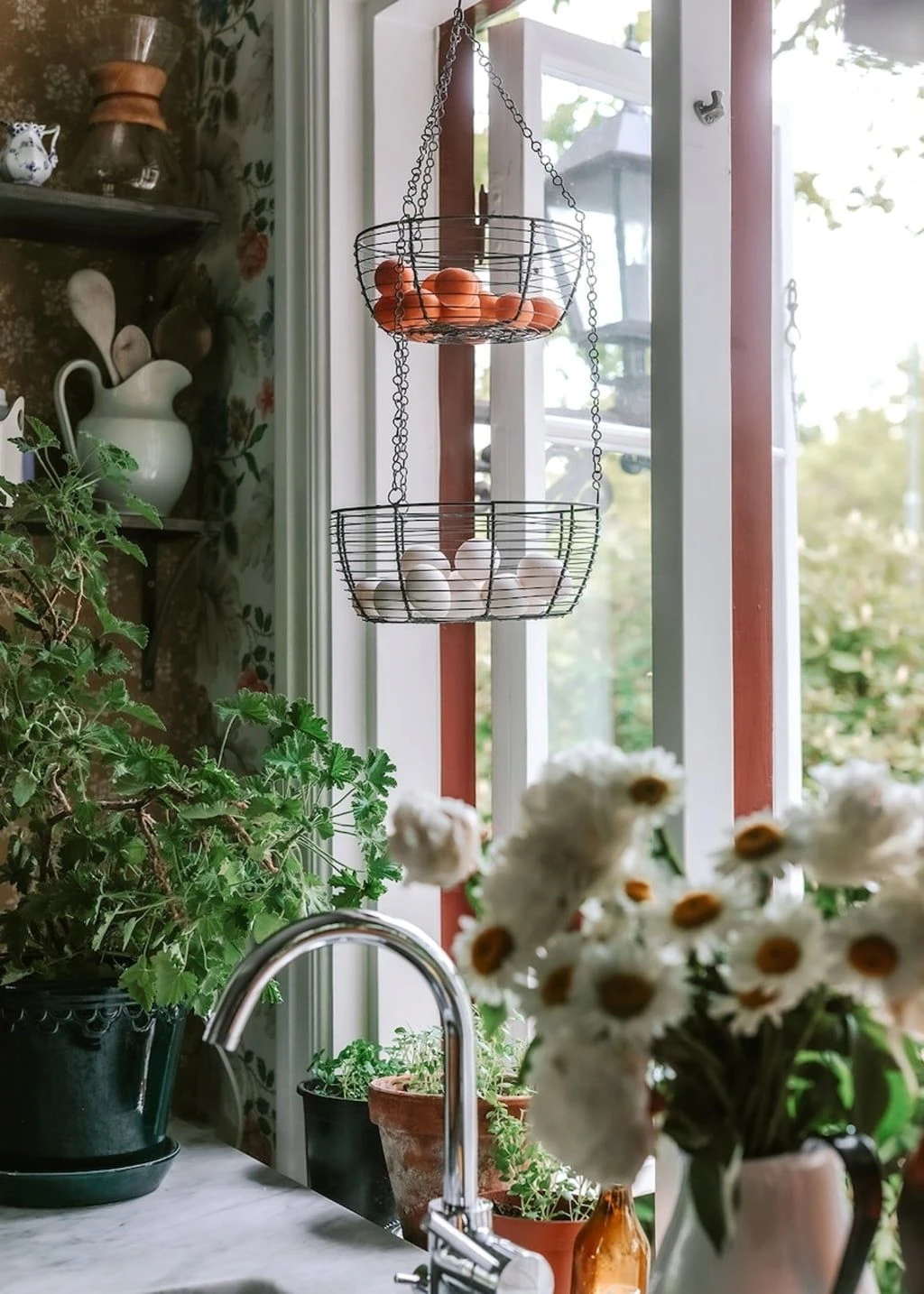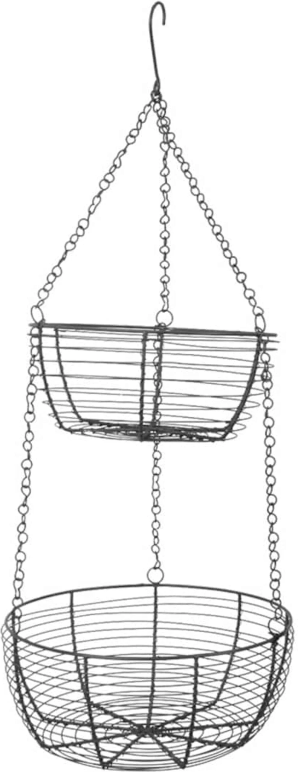 Die dekorativen Hängekörbe aus Eisen bieten den perfekte Stauraum für Obst, Gemüse usw. Sehr praktisch ist die platzsparende Montage an der Decke oder an der Unterseite eines Hängeschranks, sodass die Arbeitsfläche frei bleibt. Auch können in den zwei Körben Lebensmittel getrennt gelagert werden, die sich sonst nicht so gut vertragen.