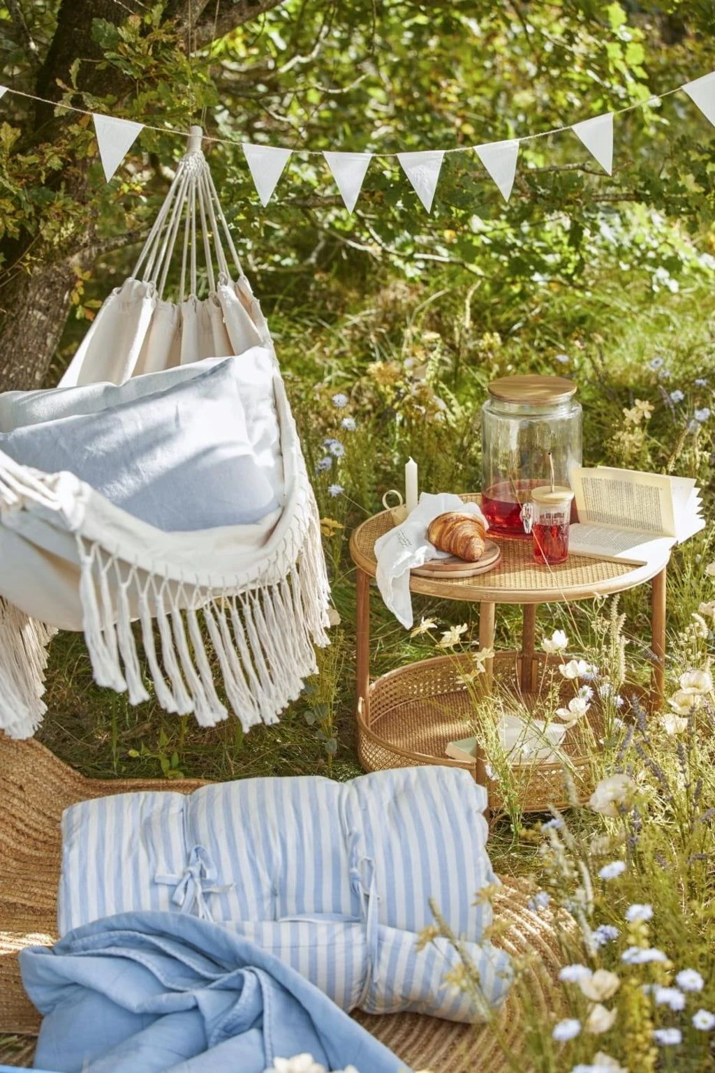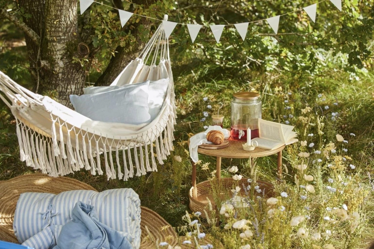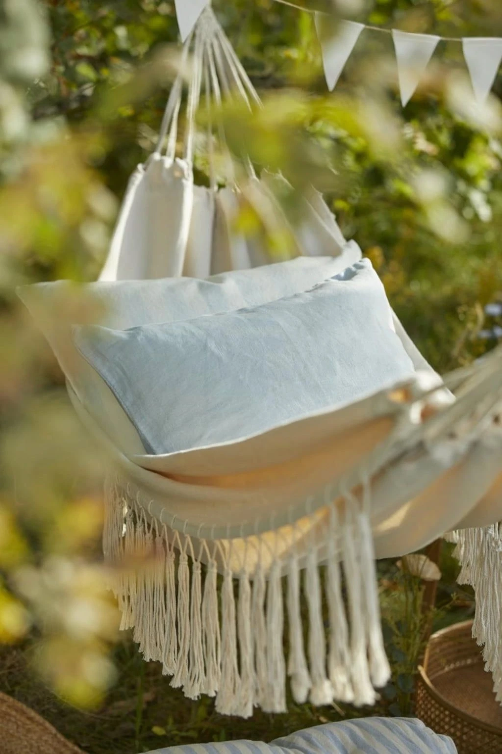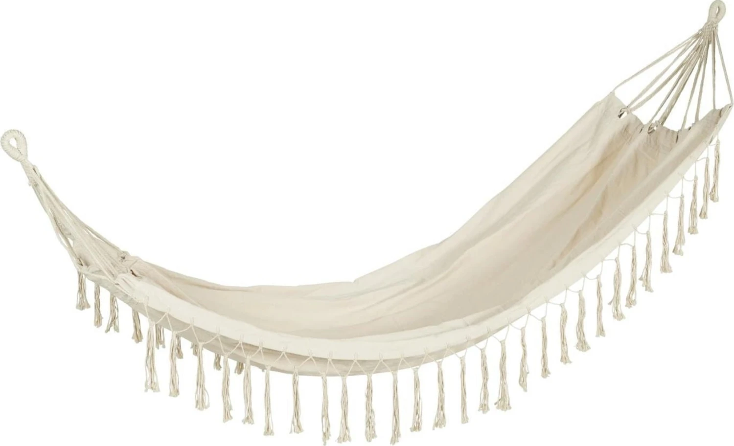 Gemütlichkeit pur verspricht diese Hängematte mit dekorativen Quasten an den Seiten. Ein sommerlicher Traum in hellem Creme, der perfekt in den Garten, die Terrasse oder den Balkon passt.