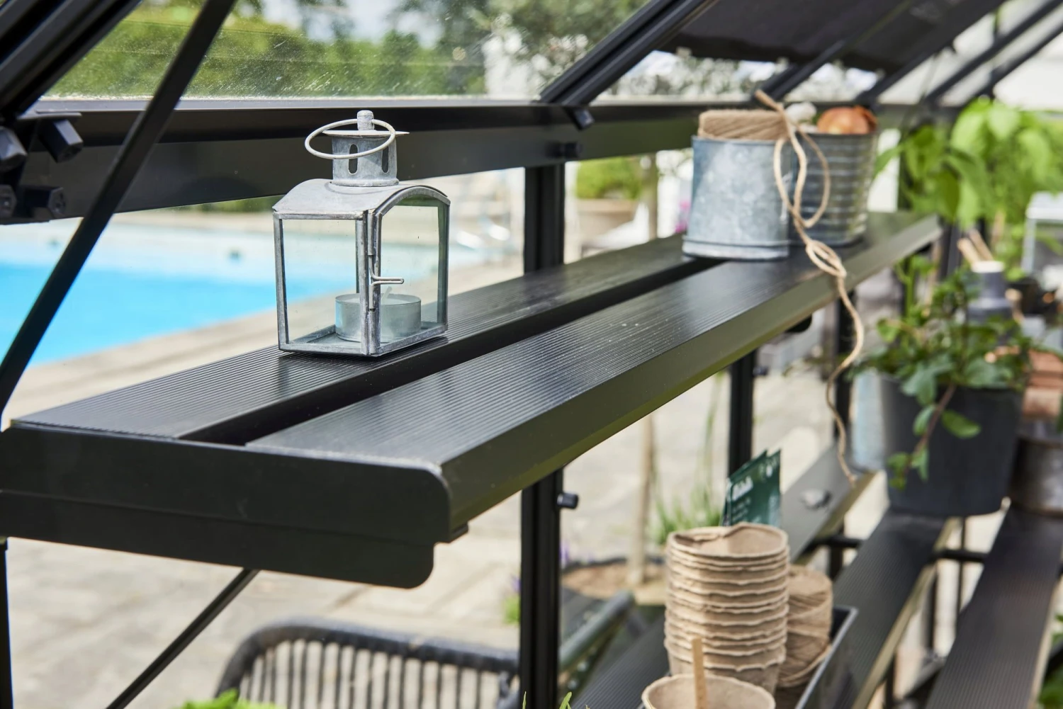 Wenn du noch mehr Stauraum und Ablagefläche in deinem „Qube“ Gewächshaus wünschst, dann ist dieses Regal die optimale Lösung. Das Regal besteht aus pulverbeschichtetem Aluminium und wird einfach in den Profilen des Gewächshauses montiert – schon hast du genügend Platz für Pflanzen, Werkzeuge und vieles mehr.