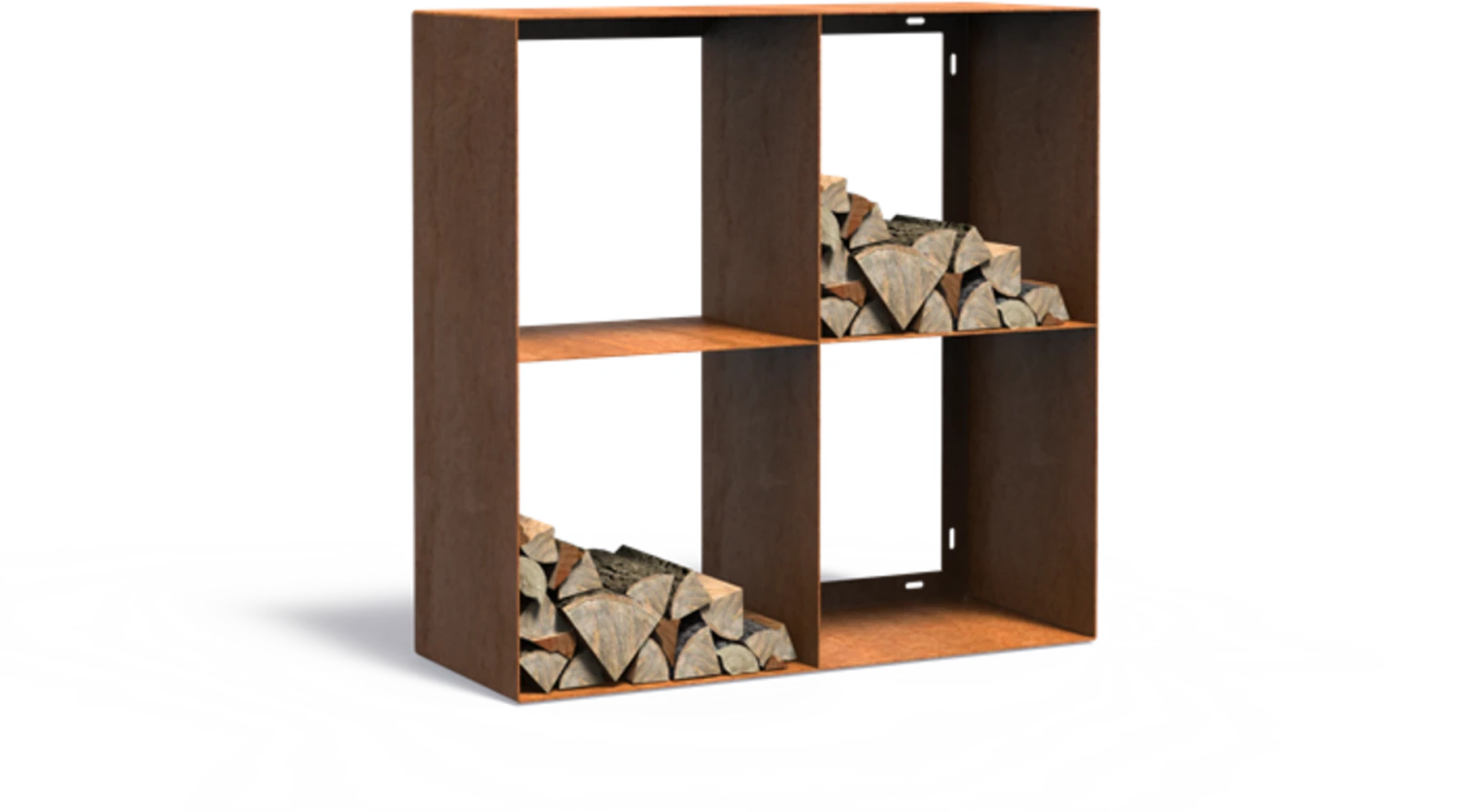 Hinweis: Die Holzaufbewahrung wird blank, ohne Rostoberfläche geliefert. Diese entwickelt sich jedoch von selbst innerhalb von 4-5 Monaten, abhängig von Witterung und Standort. Für schnellere Erfolge kann das Element mit einem Rostbeschleuniger behandelt werden.