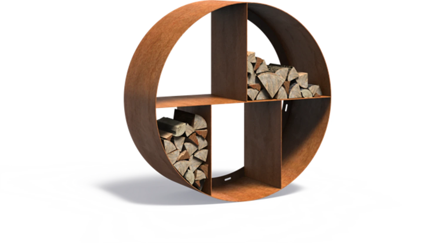 Die Holzaufbewahrung “Logg” ist mit ihrer runden Form ein harmonisch wirkendes Highlight im Garten und bietet mit den fünf Unterteilungen reichlich Platz, um Brennholz für deinen Kamin oder deine Feuerschale zu lagern. Mit den Ausnehmungen an der Rückseite kann das Element sicher an einer Wand verschraubt werden.
