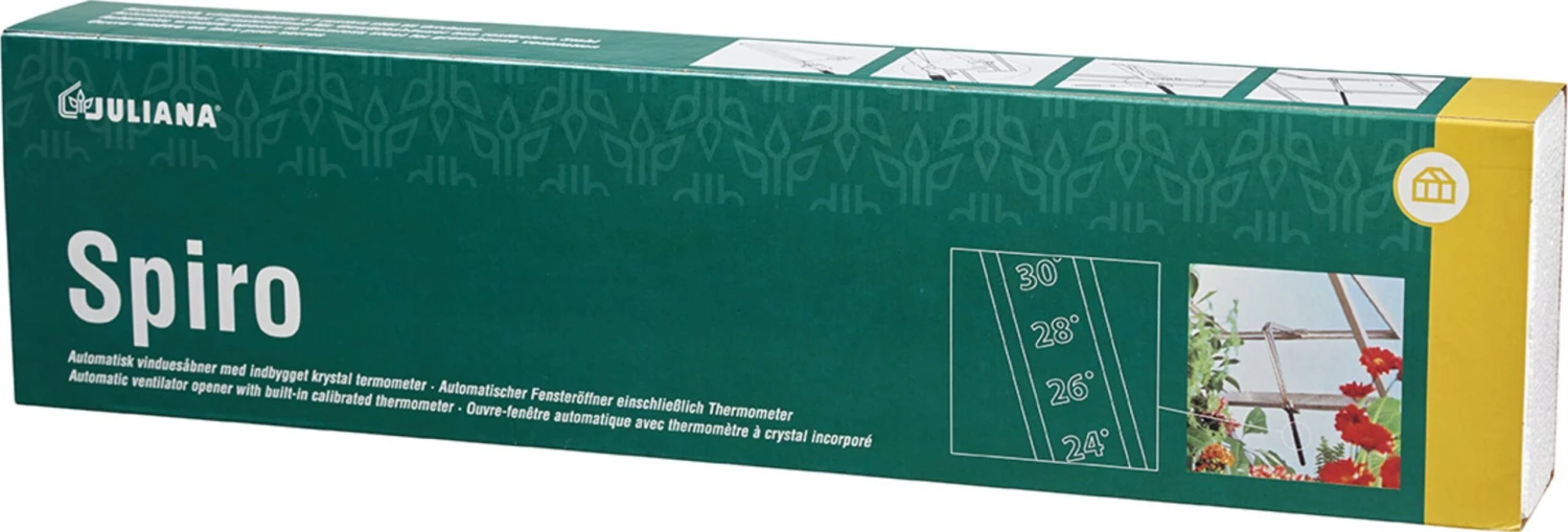 Der automatische Fensteröffner „Spiro“ sorgt zu jeder Zeit für die passende Belüftung in deinem Gewächshaus. Das robuste System aus rostfreiem Stahl wird am Fenster des Gewächshauses montiert. Bei Temperaturen zwischen 16 ºC und 25 ºC dehnt sich das Öl im Zylinder aus und das Fenster öffnet sich automatisch. Zu hohe Temperaturen sowie eine zu hohe Luftfeuchtigkeit können somit effektiv verhindert werden.