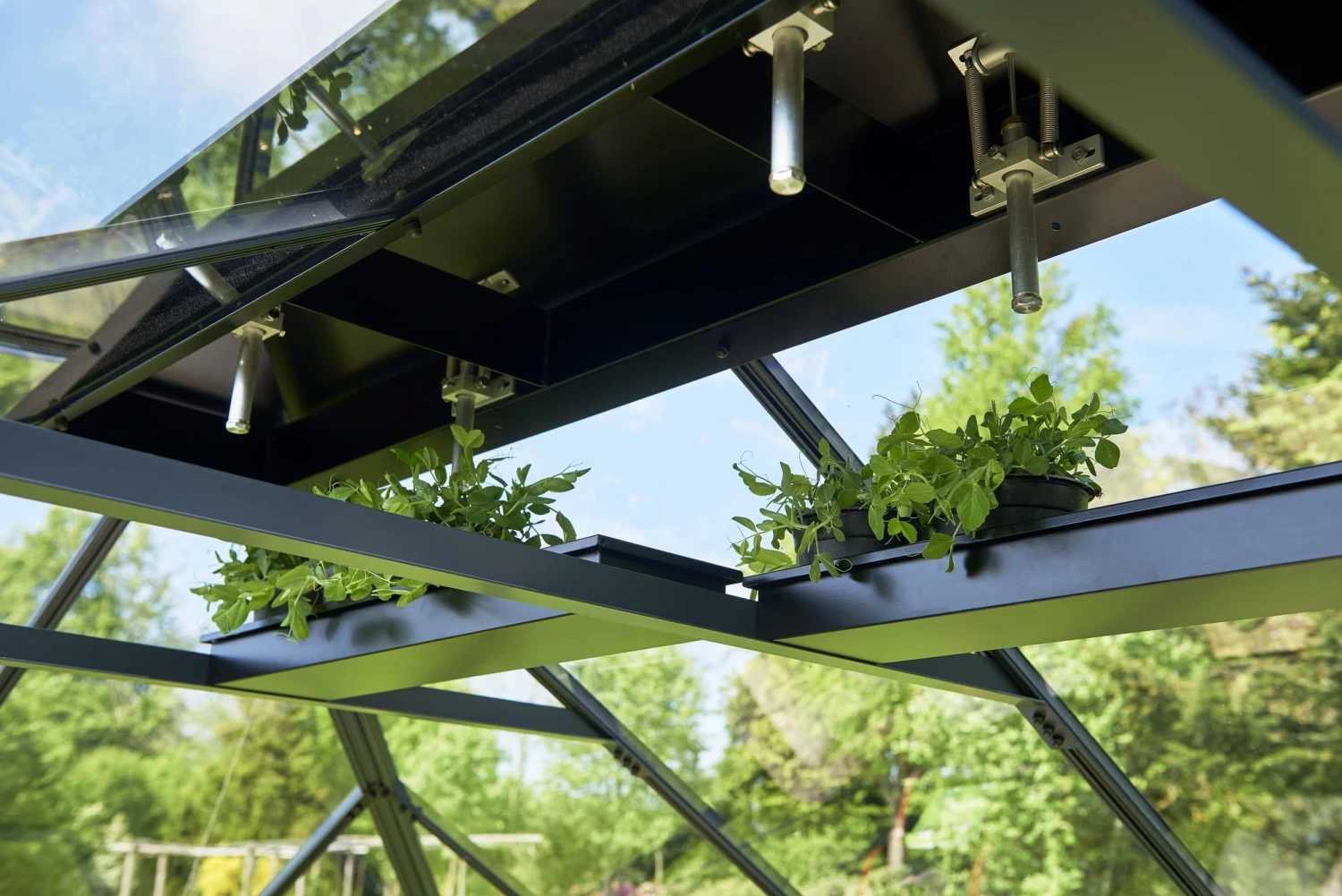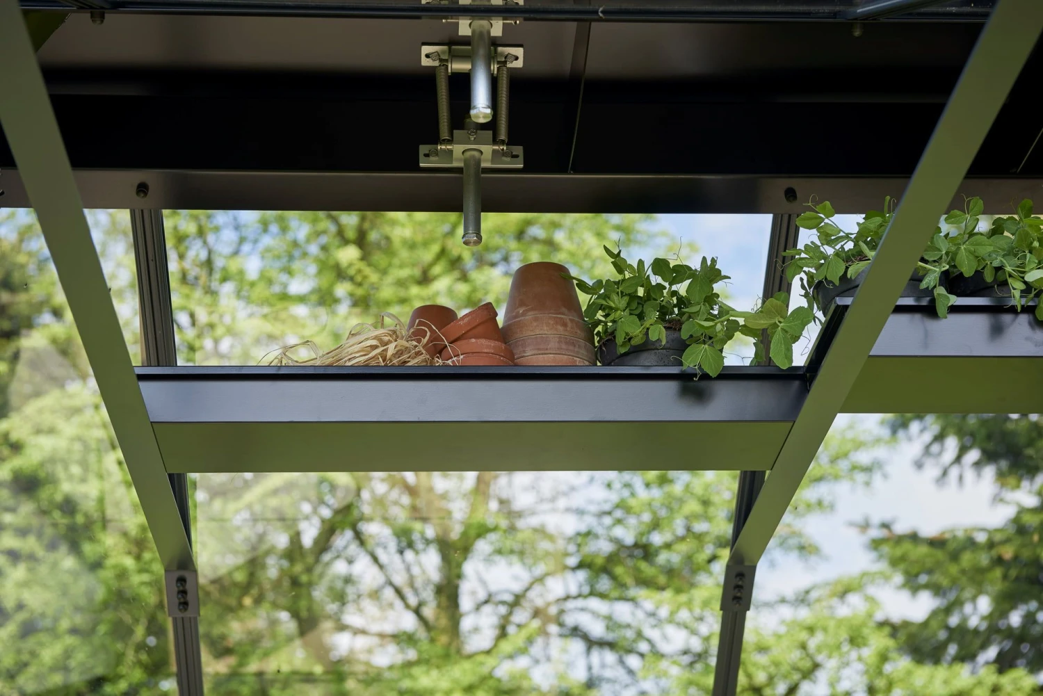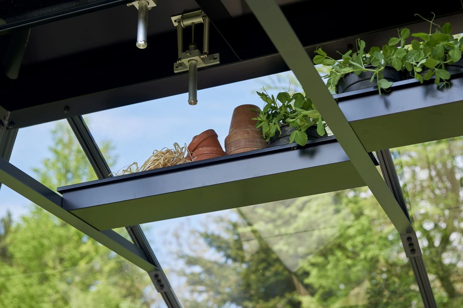 Das Gipfelregal eignet sich für alle Juliana Gewächshäuser mit Kehlbalken und ermöglicht es dir, die volle Höhe auszunutzen. Nutze das Regal zum Verstauen von Töpfen oder als Gefäß für deine Pflanzen. Die Möglichkeit der Wassergabe wurde zudem schlau gelöst, da deine Pflanzen von unten bewässert werden können.