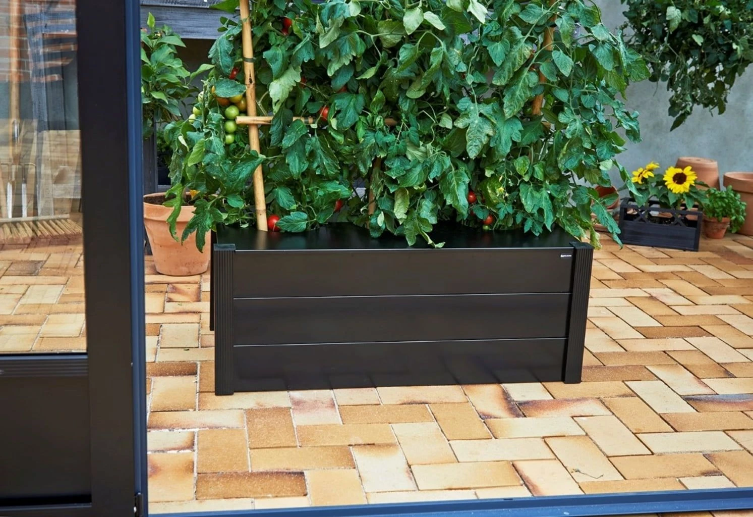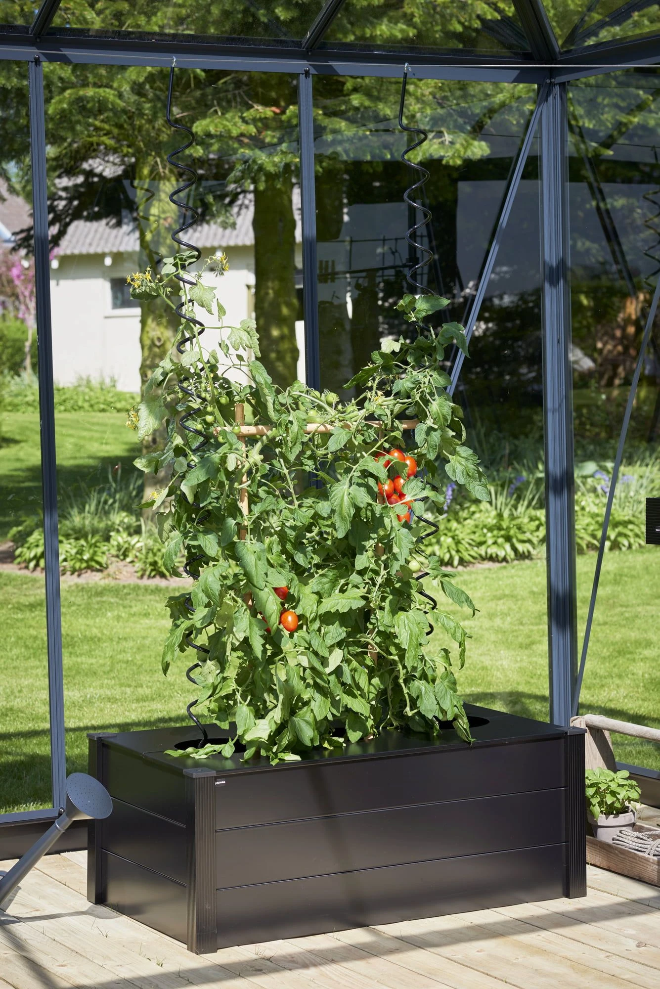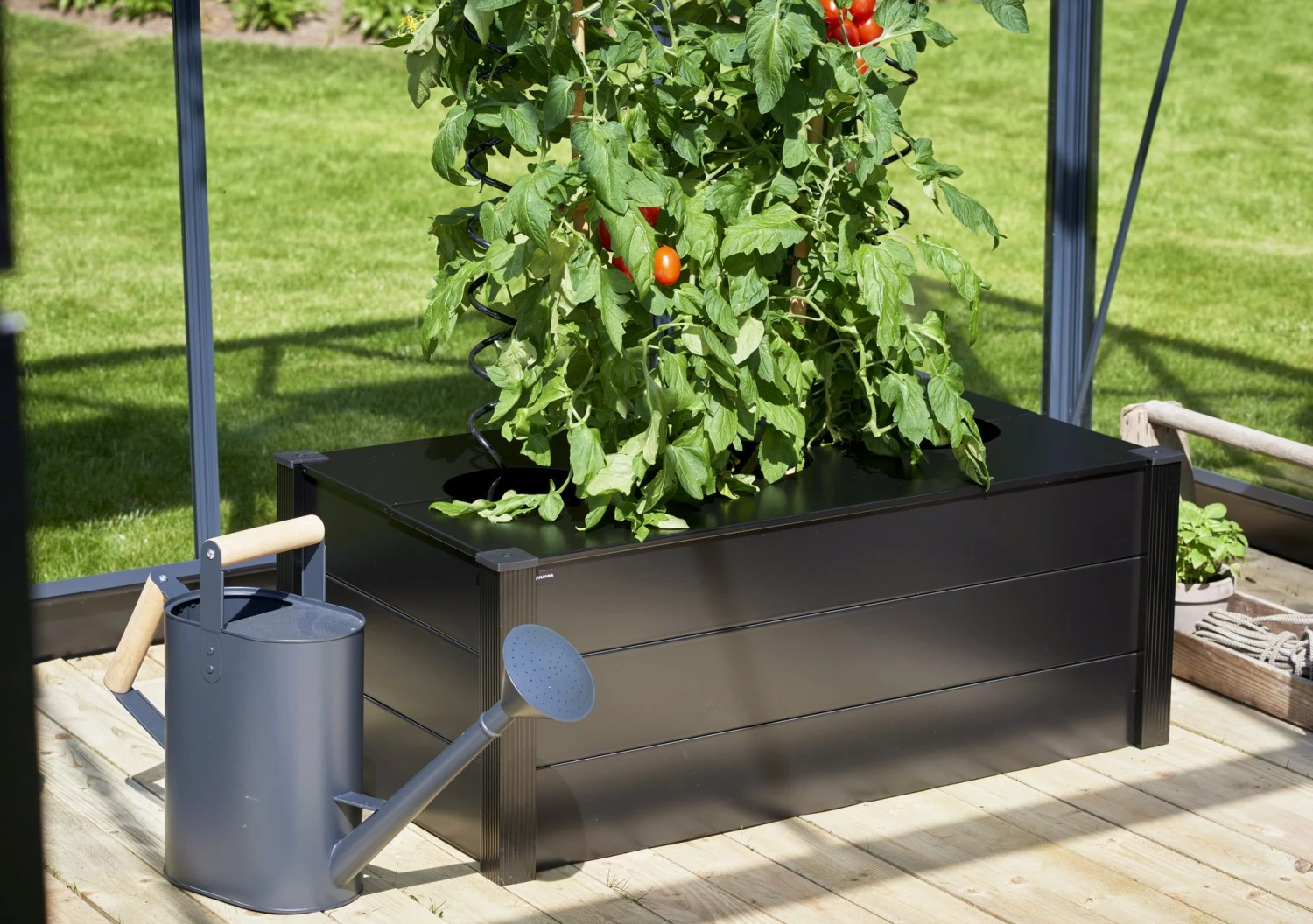 Der Pflanzkasten von Juliana macht es möglich, Tomatenpflanzen auf elegante Weise anzubauen. Der Deckel mit den drei Ausnehmungen ist in der Mitte geteilt und kann unkompliziert aufgeklappt werden. Das robuste Material wurde mit einer schwarzen Pulverbeschichtung versehen und fügt sich dadurch nahtlos in die Optik deines Juliana Gewächshauses ein.