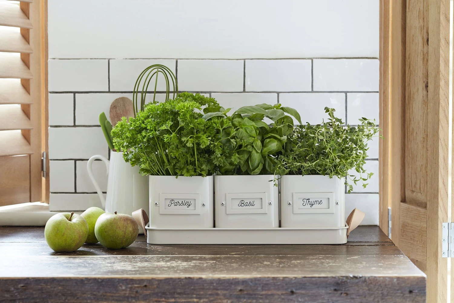 Dieses Set bietet eine besonders schöne Möglichkeit, deine Küchenkräuter zu präsentieren. Die drei kleinen Töpfchen haben genau die richtige Größe für lebende Kräuter aus dem Supermarkt und verfügen bereits über eine Bezeichnung der drei gängigsten Kräutersorten in englischer Sprache (Parsley, Basil & Thyme). Die drei hübschen Töpfchen stehen in einem passgenauen Tablett mit seitlich angebrachten Henkeln aus Leder. Das ermöglicht nicht nur einen komfortablen Transport, sondern sieht noch dazu ganz bezaubernd aus.