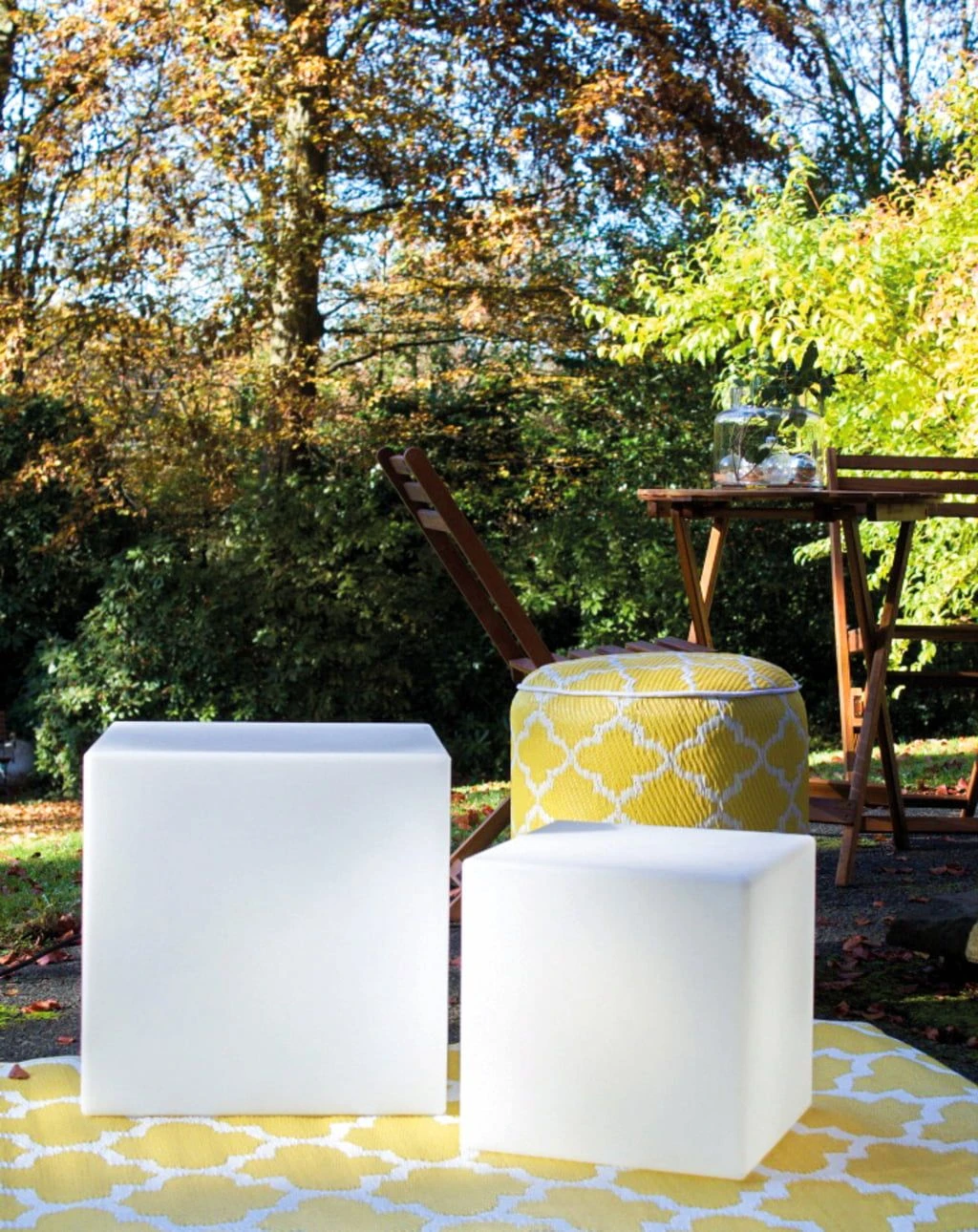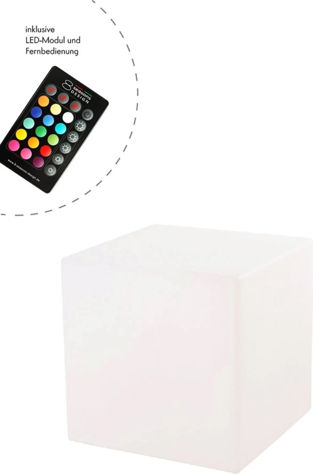 Der aus hochwertigem und robustem Kunststoff gefertigte Leuchtwürfel „Shining Cube“ sorgt sowohl drinnen als auch draußen für ein stimmungsvolles Ambiente, egal ob als Lampe, Beistelltisch oder Hocker. Mittels der im Lieferumfang enthaltenen Fernbedienung kann die Lichtfarbe des vorinstallierten RGB LED-Leuchtmittels beliebig gewählt werden: 15 Farben, 5-fach dimmbar stehen zur Auswahl. Ein absoluter Blickfang, der sich sowohl im Innen- als auch im geschützten Außenbereich wohlfühlt.