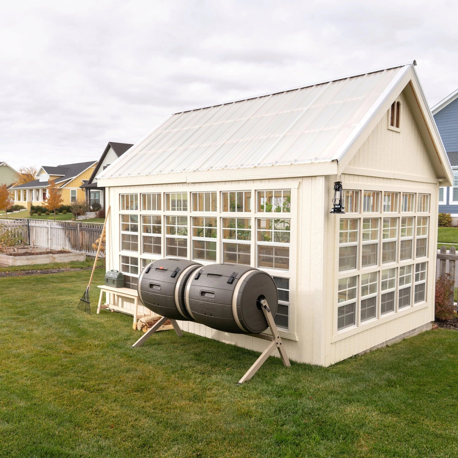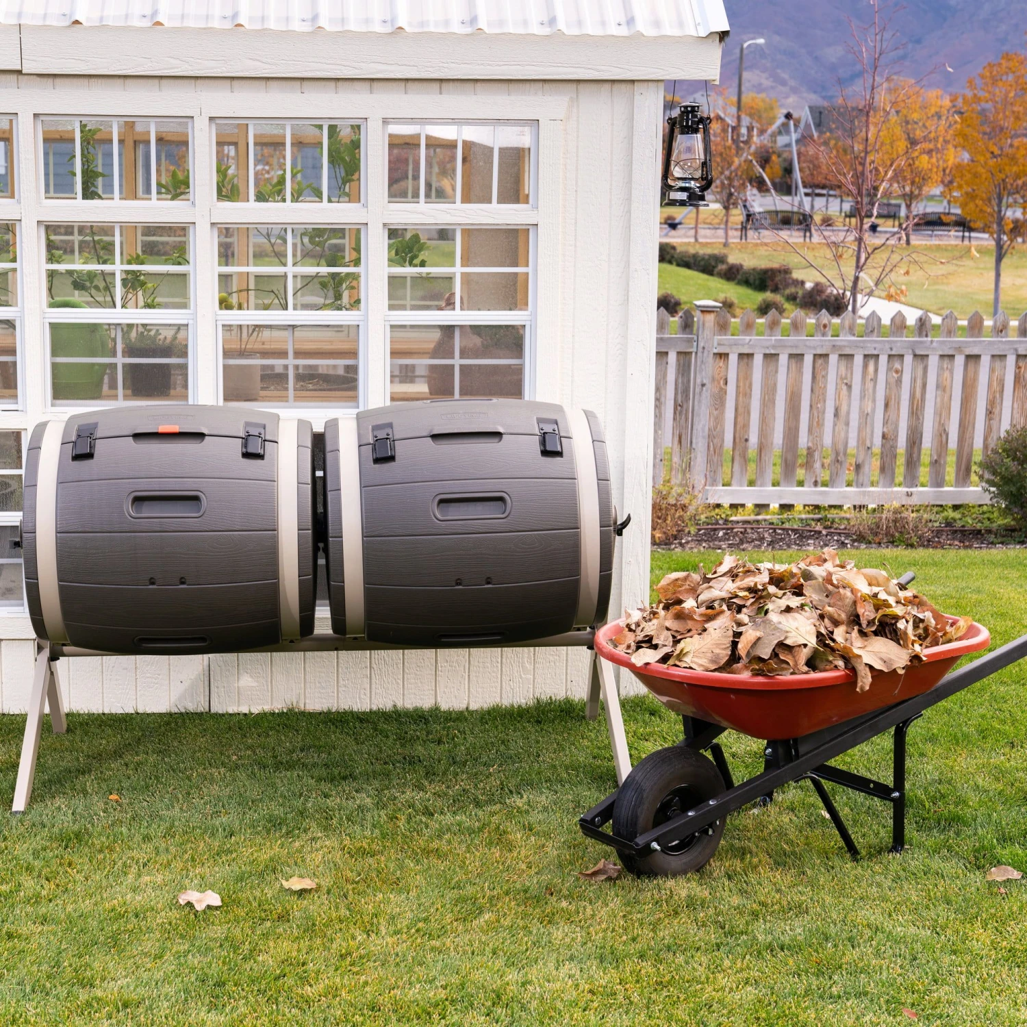 Dieser Doppelkomposter bietet mit zwei Fässern mit jeweils 190 l Fassungsvermögen jede Menge Platz für deine biologischen Küchen- und Gartenabfälle uns wandelt diese dank seiner innovativen Konstruktion schnell, sauber und geruchsneutral in wertvollen Kompost um.