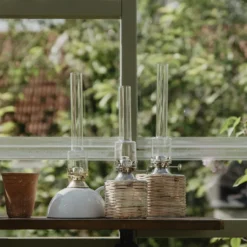 Der Glasbehälter dieser Petroleumlampe ist mit einem wunderschönen Korbgeflecht ummantelt, wohingegen der Brenner in Silber gehalten wurde. Der Glaszylinder schützt die Flamme vor dem Verlöschen. Mit dem Einstellrad kann die Höhe der Flamme und somit auch die Lichtstärke angepasst werden.