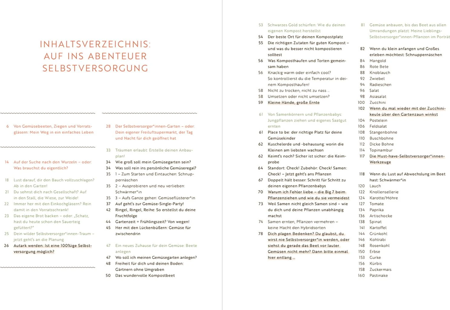 Die Autorin dieses Buches Marie Diederich lässt dich in diesem Buch an ihren Erfahrungen als Selbstversorgerin teilhaben und zeigt dir anhand praxisnaher Schritt-für-Schritt-Anleitungen, wie auch du dein eigenes Gemüse züchten, Brot backen, Hühner sowie andere Tiere halten und deine Ernte haltbar machen kannst. Dabei lernst du ihre eigene, selbst entwickelte Gärtnermethode ebenso kennen wie verschiedene andere Herangehensweisen an das Thema Selbstversorgung.