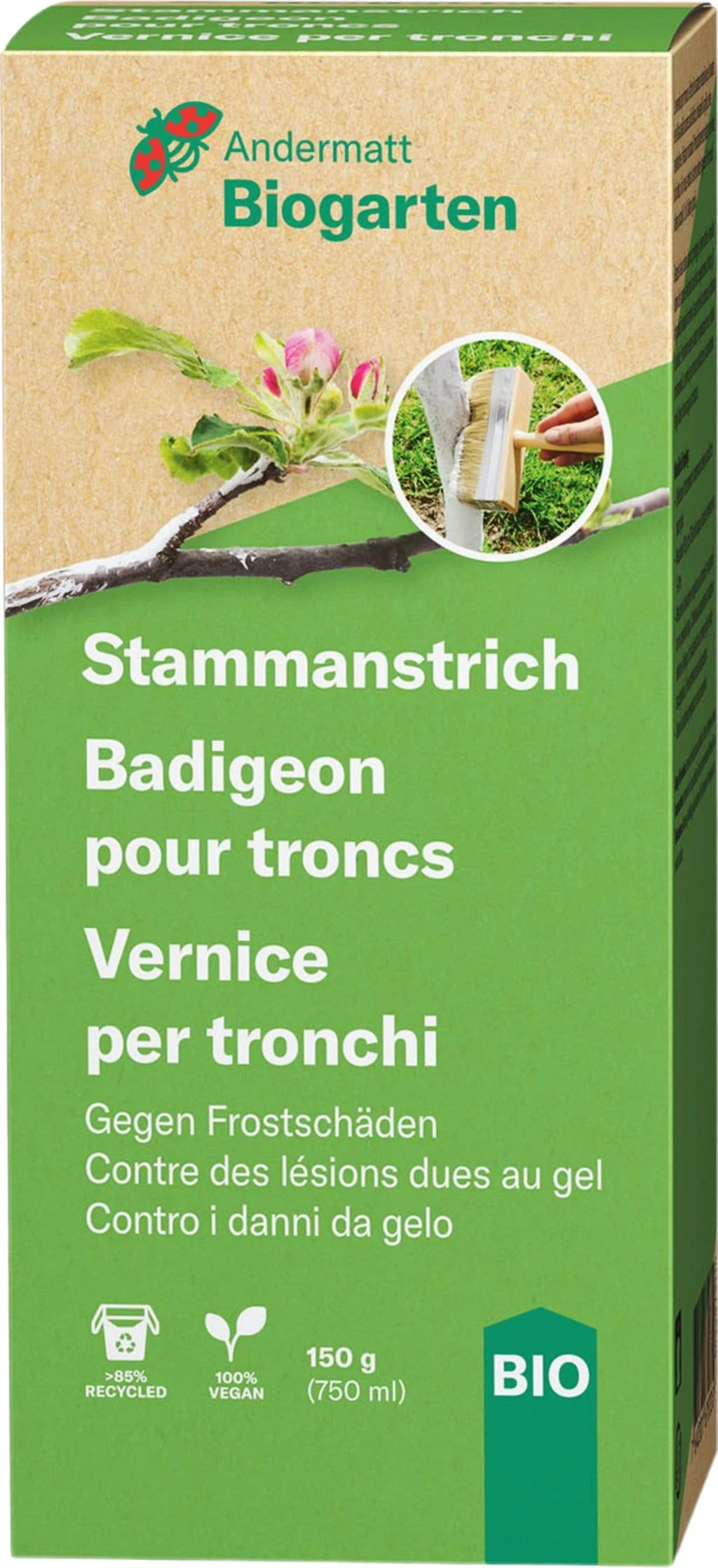 Der pflegende Stammanstrich von Andermatt Biogarten ist schnell aufgetragen und beugt Frostrissen an Bäumen und Sträuchern vor. Der helle Anstrich reflektiert das Sonnenlicht und wirkt einer zu starken Erwärmung der Rinde entgegen. Frostrisse und das Eindringen von Bakterien, Pilzen und Viren können somit effektiv verhindert werden. Der natürliche Stammanstrich besteht aus Kieselsäure, Tonmineralien, Wildkräutern und natürlichen Haftmitteln. Im Gegensatz zu Kalk pflegt der Anstrich die Zellen und trocknet diese nicht aus.