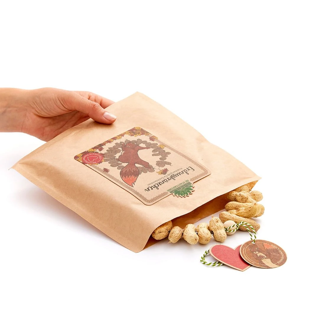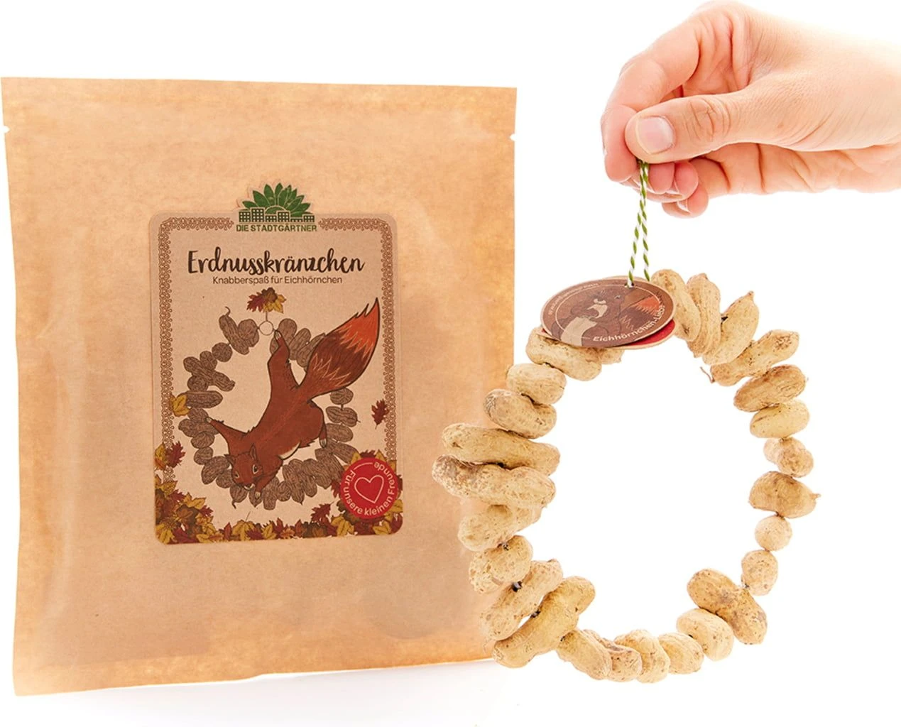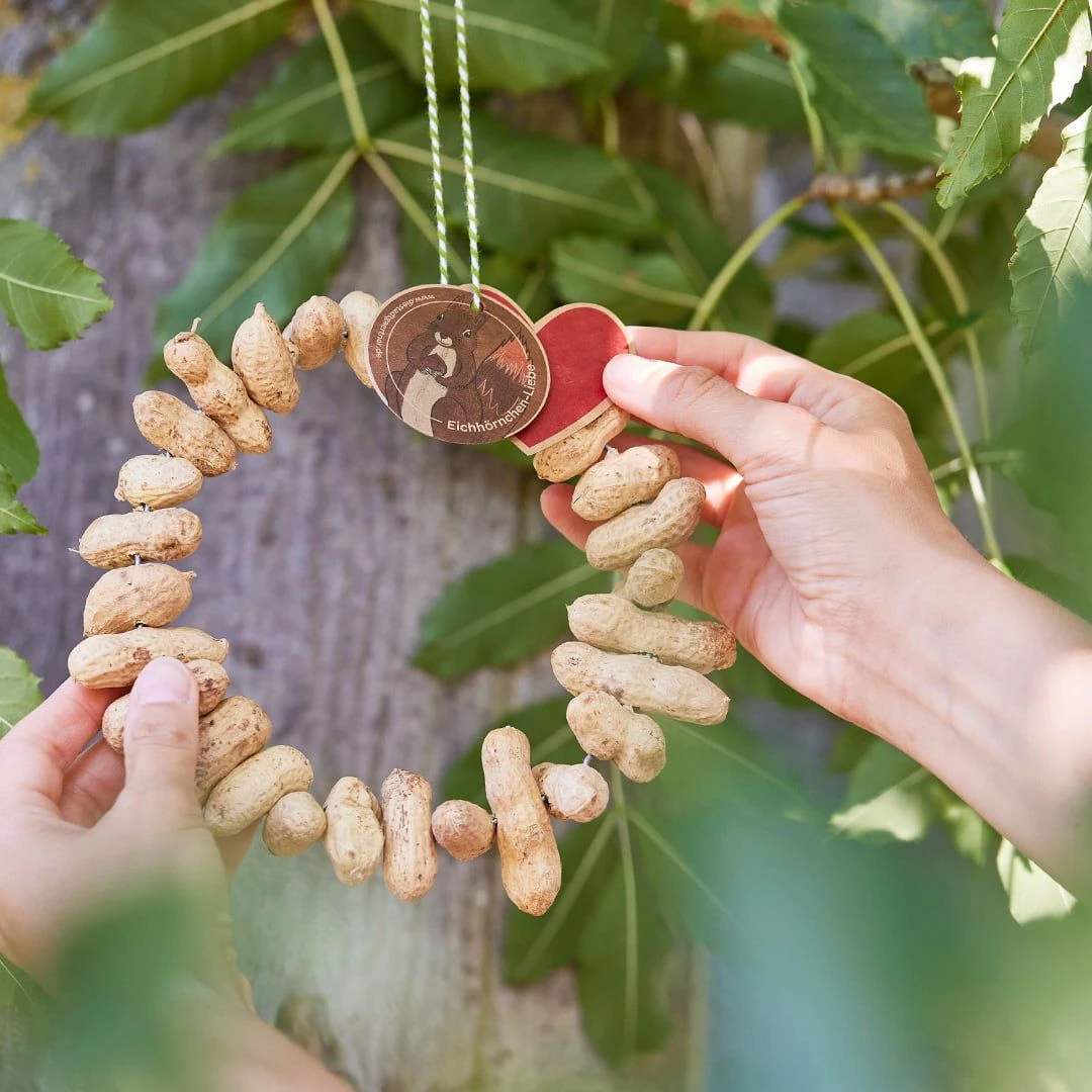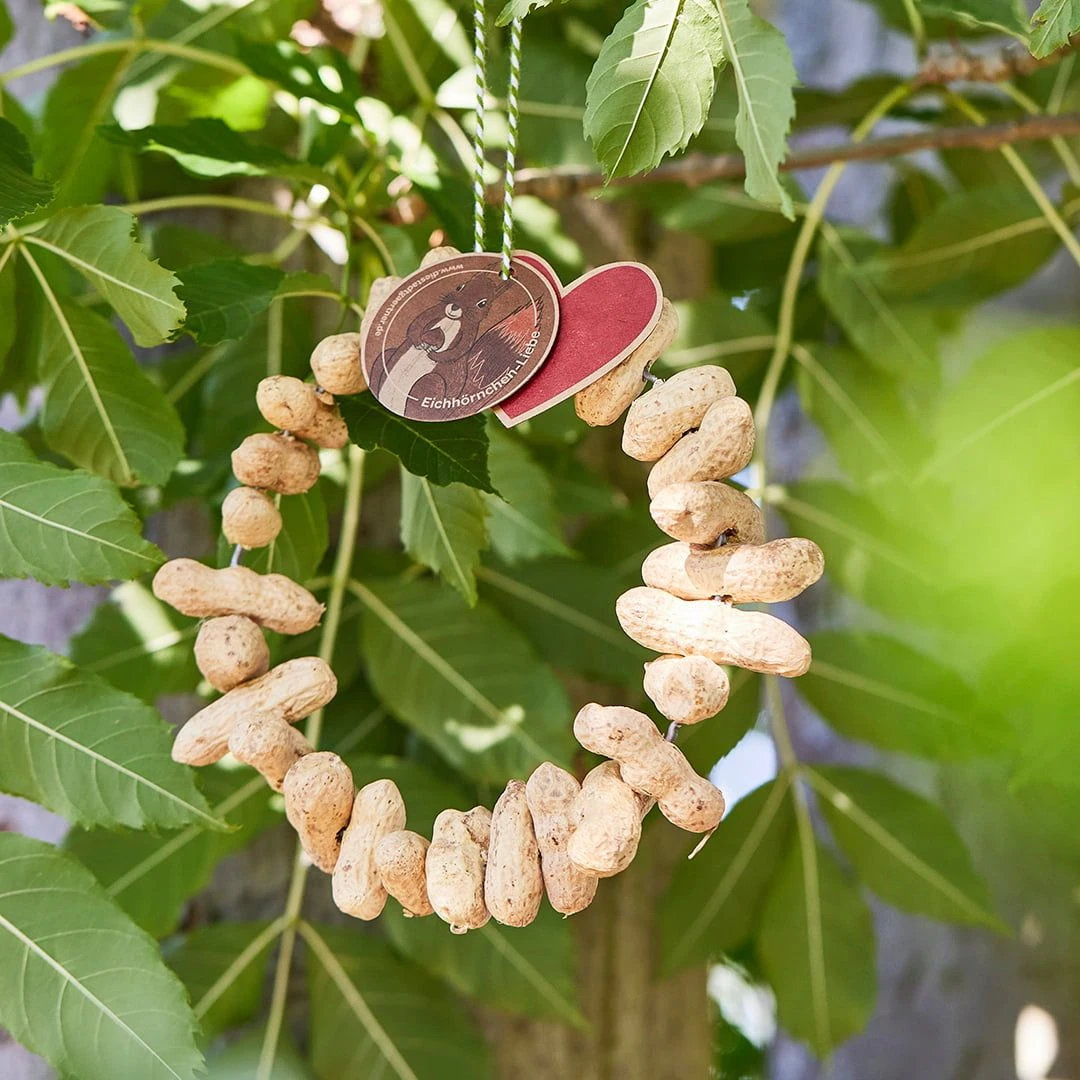 Mit diesem dekorativen Erdnusskränzchen kannst du den Eichhörnchen in deinem Garten einen ganz besonderen Leckerbissen bieten und sie nicht nur in der kalten Jahreszeit mit hochwertigem Futter unterstützen. Das bringt noch mehr Leben in deinen Garten und macht dessen tierische Besucher rundum glücklich.