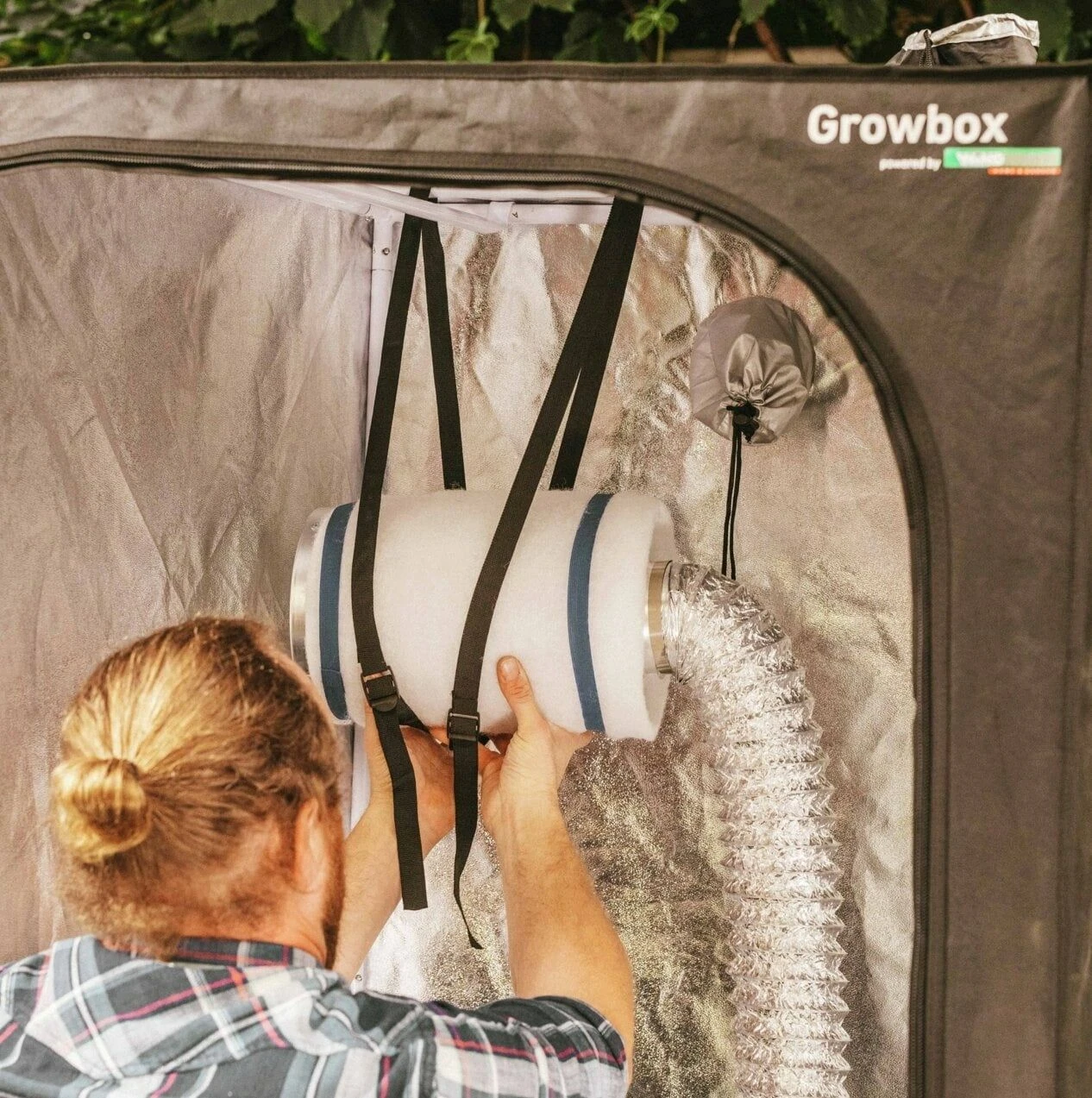 Die Fixierung des Aktivkohlefilters im Inneren der Growbox erfolgt mittels verstellbarer Halteriemen. Er wird mit dem 5 m langen Abluftschlauch verbunden und außerhalb der Growbox wird ein Rohrventilator mit einem Luftdurchsatz von 170 m3 pro Stunde angeschlossen.