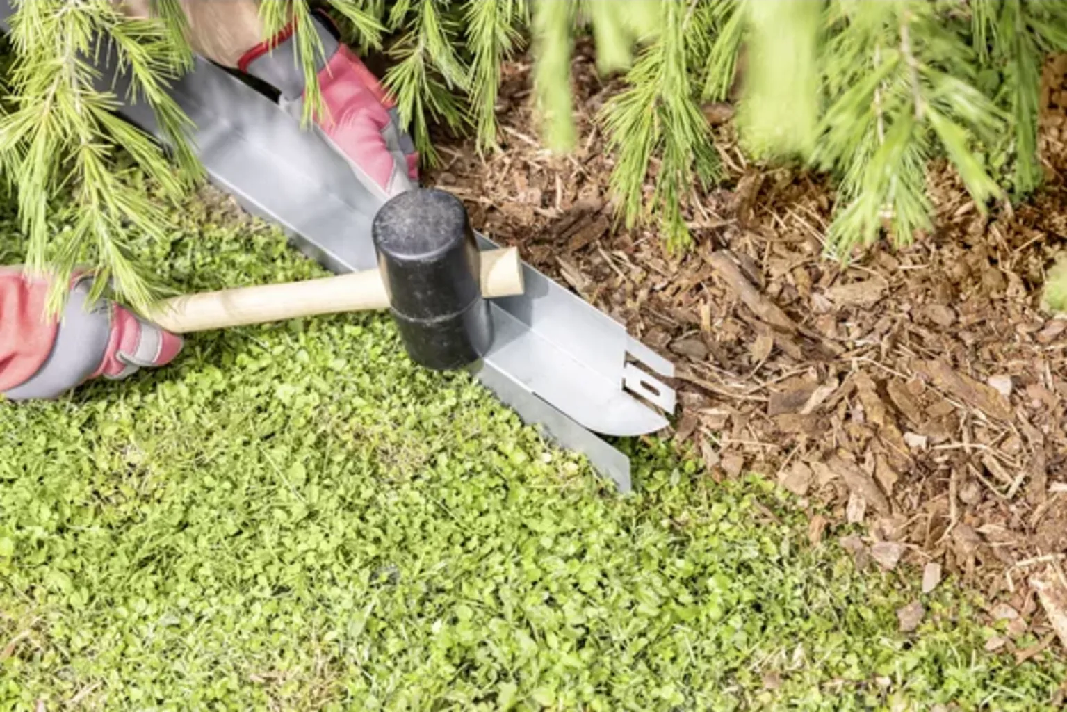 Tipp: Zum Verlegen die Mähkante einfach nur in die Erde drücken und bei Bedarf mit einem Gummihammer nachhelfen. Bei sehr festem Boden mit einem Spaten vorstechen.