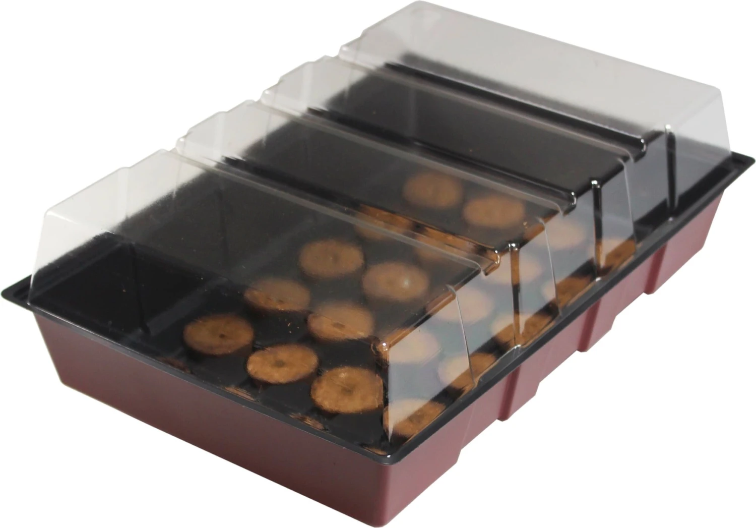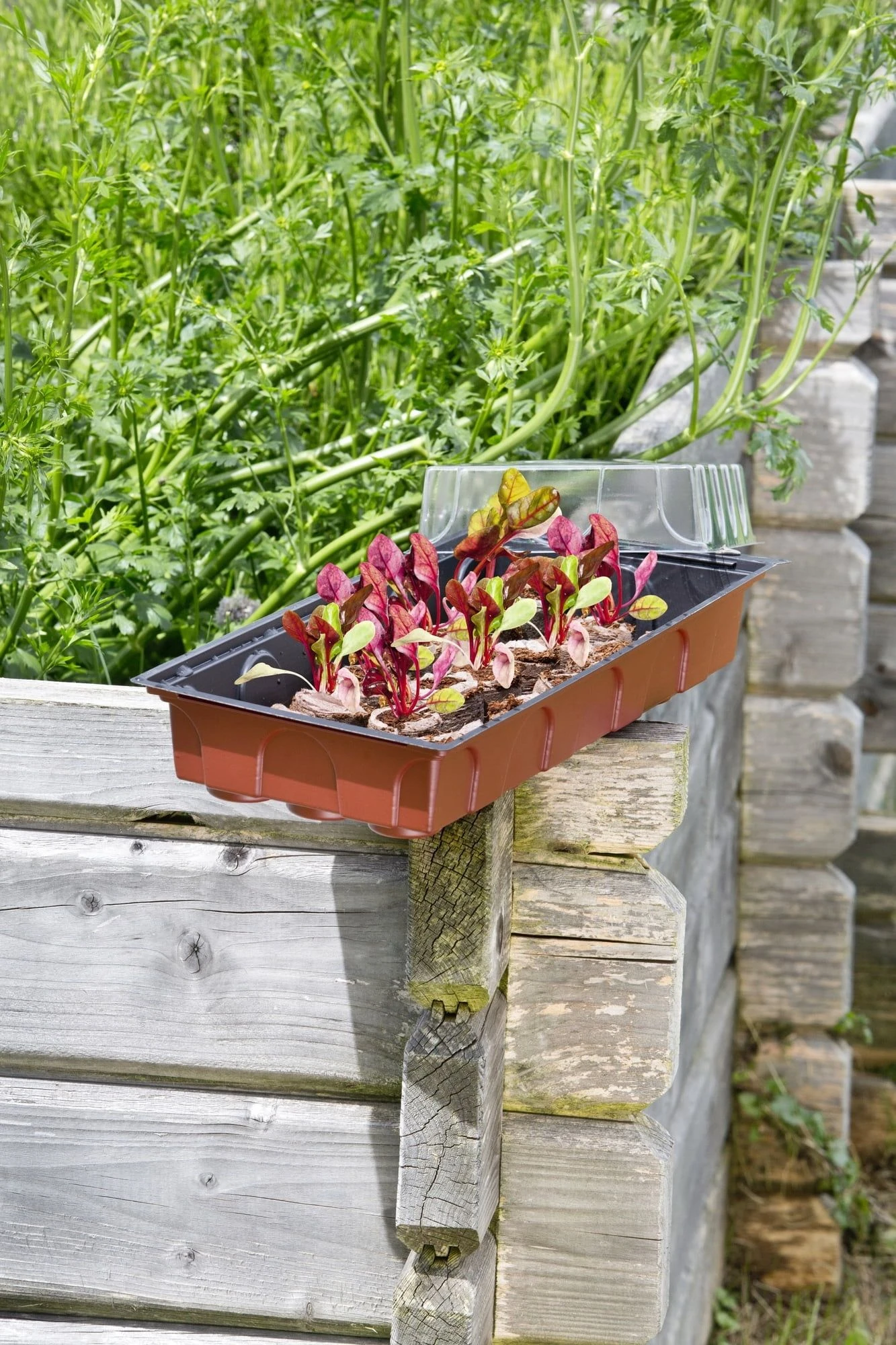Die terracotta-farbige, robuste Kunststoffschale mit Klarsichthaube sorgt für ein Treibhausklima in dem Keimlinge zeitiger und besser gedeihen, mit oder ohne Anzucht-Quelltabs.
